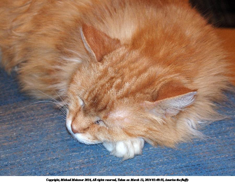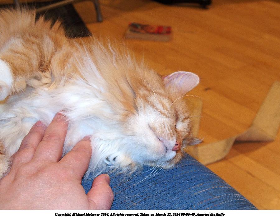 Picture #37: America the fluffy #2 900x698, 107,032 bytes (105K), (html file) Copyright, Michael Meissner 2014, All rights reserved Olympus Stylus-1 camera f/2.8, ISO 400, flash, 1/50 sec, 10.8mm, auto mode, vivid color, SHQ, matrix metering, IS Auto, noise reduction auto, noise filter low 35mm equivalent focal length 50.0mm Programs used: crop, raw therapee Taken by Michael Meissner on March 12, 2014 00:06:49 Last modified on March 12, 2014 at 08:40 |