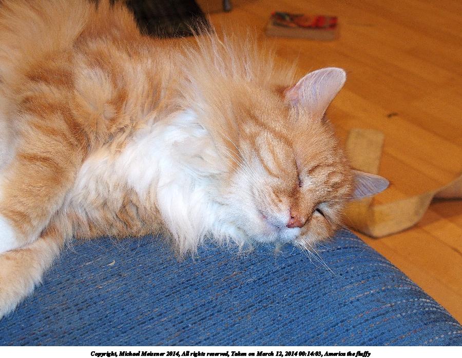Picture #38: America the fluffy 900x698, 116,645 bytes (114K), (html file) Copyright, Michael Meissner 2014, All rights reserved Olympus Stylus-1 camera f/2.8, ISO 400, flash, 1/50 sec, 10.8mm, auto mode, vivid color, SHQ, matrix metering, IS Auto, noise reduction auto, noise filter low 35mm equivalent focal length 50.0mm Programs used: crop, raw therapee Taken by Michael Meissner on March 12, 2014 00:06:11 Last modified on March 12, 2014 at 08:39 |