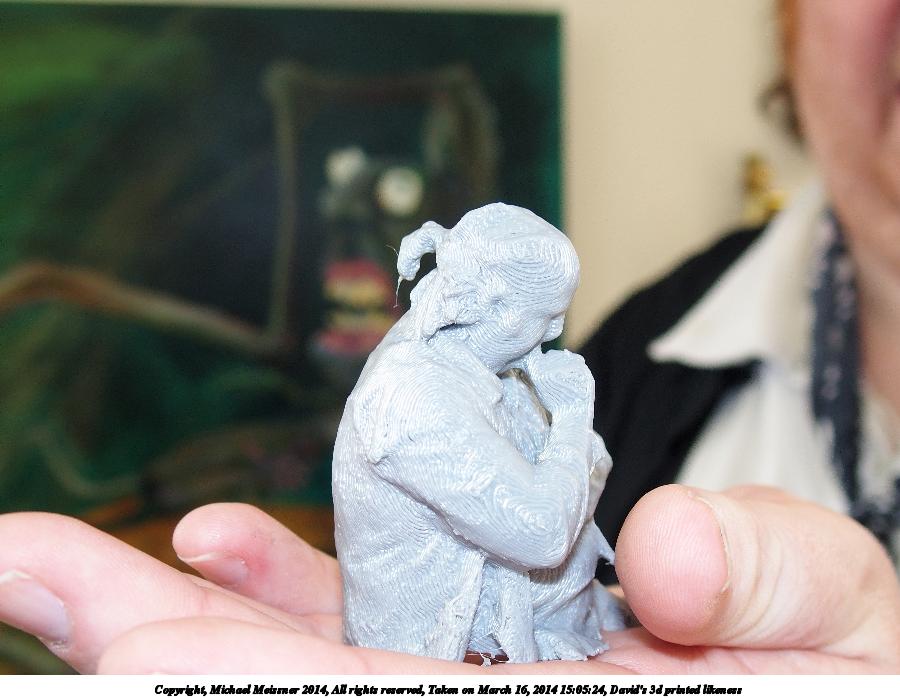 Picture #20: David's 3d printed likeness 900x698, 84,341 bytes (83K), (html file) Copyright, Michael Meissner 2014, All rights reserved Olympus Stylus-1 camera f/2.8, ISO 200, flash, 1/50 sec, 9.0mm, auto mode, vivid color, SHQ, matrix metering, IS Auto, noise reduction auto, noise filter low 35mm equivalent focal length 42.0mm Programs used: crop, raw therapee Taken by Michael Meissner on March 16, 2014 15:05:24 Last modified on March 30, 2014 at 16:24 |