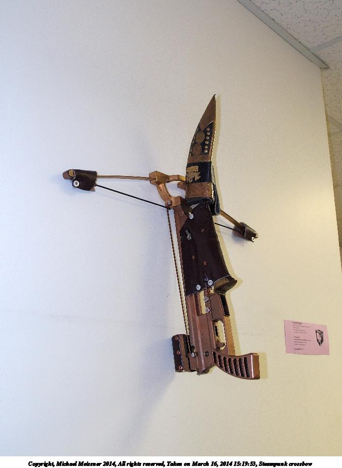 Picture #12: Steampunk crossbow #2 675x923, 79,857 bytes (78K), (html file) Copyright, Michael Meissner 2014, All rights reserved Olympus Stylus-1 camera f/2.8, ISO 320, flash, 1/30 sec, 6.0mm, auto mode, vivid color, SHQ, matrix metering, IS Auto, noise reduction auto, noise filter low 35mm equivalent focal length 28.0mm Programs used: crop, raw therapee, rotate left Taken by Michael Meissner on March 16, 2014 15:20:05 Last modified on March 30, 2014 at 16:26 |