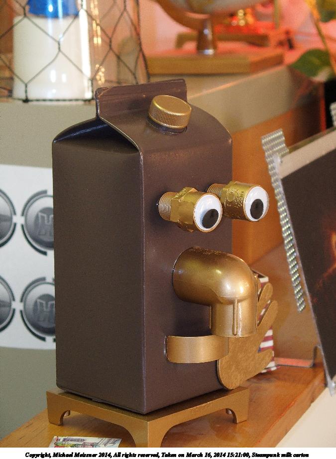 Picture #11: Steampunk milk carton 675x923, 98,380 bytes (97K), (html file) Copyright, Michael Meissner 2014, All rights reserved Olympus Stylus-1 camera f/2.8, ISO 400, flash, 1/60 sec, 21.2mm, auto mode, vivid color, SHQ, matrix metering, IS Auto, noise reduction auto, noise filter low 35mm equivalent focal length 100.0mm Programs used: crop, raw therapee, rotate left Taken by Michael Meissner on March 16, 2014 15:21:00 Last modified on March 30, 2014 at 16:27 |