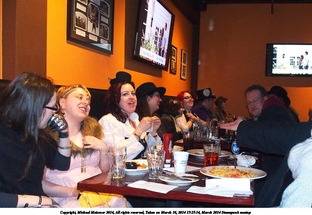 Picture #27: March 2014 Steampunk meetup #6 900x698, 108,157 bytes (106K), (html file) Copyright, Michael Meissner 2014, All rights reserved Olympus Stylus-1 camera f/2.8, ISO 100, flash, 1/60 sec, 6.0mm, auto mode, vivid color, SHQ, matrix metering, IS Auto, noise reduction auto, noise filter low 35mm equivalent focal length 28.0mm Programs used: crop, raw therapee Taken by Michael Meissner on March 16, 2014 14:31:03 Last modified on March 30, 2014 at 16:19 |
