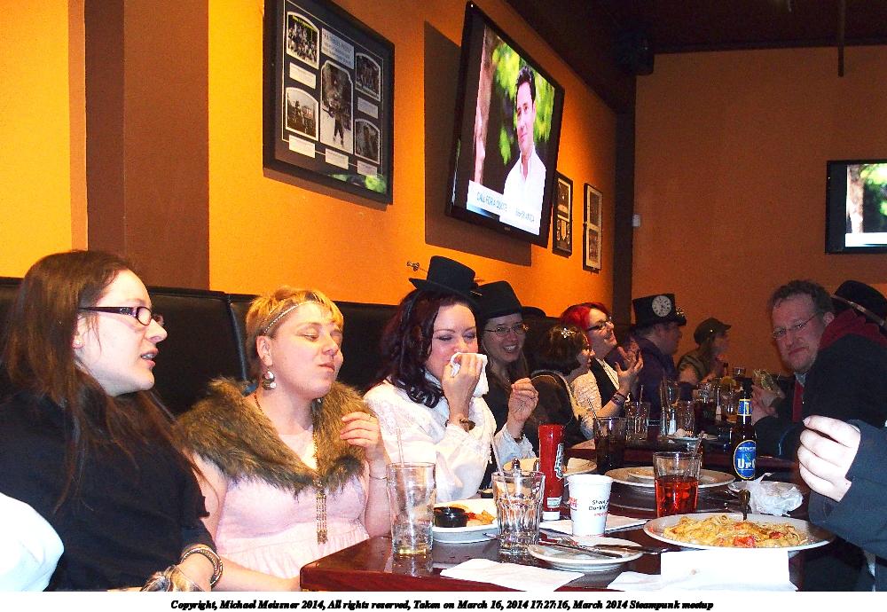 Picture #29: March 2014 Steampunk meetup #4 675x923, 89,768 bytes (88K), (html file) Copyright, Michael Meissner 2014, All rights reserved Olympus Stylus-1 camera f/2.8, ISO 100, flash, 1/60 sec, 6.0mm, auto mode, vivid color, SHQ, matrix metering, IS Auto, noise reduction auto, noise filter low 35mm equivalent focal length 28.0mm Programs used: crop, raw therapee, rotate left Taken by Michael Meissner on March 16, 2014 14:25:37 Last modified on March 30, 2014 at 16:18 |