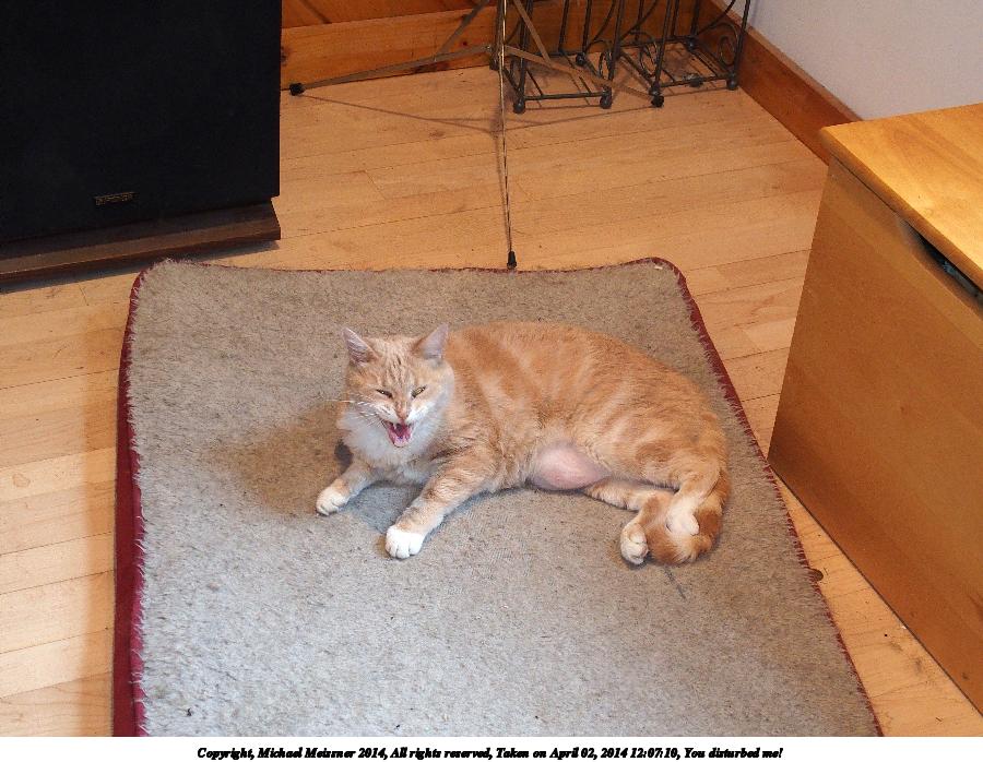 Picture #8: You disturbed me! 900x698, 122,488 bytes (120K), (html file) Copyright, Michael Meissner 2014, All rights reserved Olympus Stylus-1 camera f/2.8, ISO 400, flash, 1/50 sec, 12.0mm, auto mode, vivid color, SHQ, matrix metering, IS Auto, noise reduction auto, noise filter low 35mm equivalent focal length 57.0mm Programs used: crop, raw therapee Taken by Michael Meissner on April 02, 2014 12:07:10 Last modified on May 05, 2014 at 22:09 |