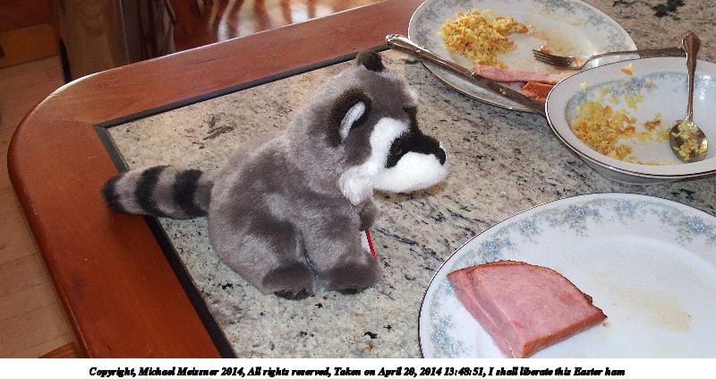 Picture #6: I shall liberate this Easter ham 800x423, 88,816 bytes (87K), (html file) Copyright, Michael Meissner 2014, All rights reserved Olympus Stylus-1 camera f/2.8, ISO 400, flash, 1/30 sec, 7.4mm, auto mode, vivid color, SHQ, matrix metering, IS Auto, noise reduction auto, noise filter low 35mm equivalent focal length 35.0mm Programs used: crop, gimp, raw therapee Taken by Michael Meissner on April 20, 2014 13:48:51 Last modified on May 05, 2014 at 22:10 |