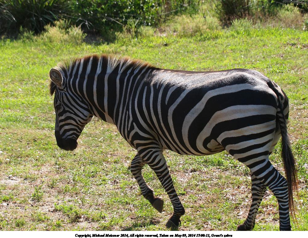 Picture #44: Grant's zebra #5 1000x773, 256,702 bytes (251K), (html file) Copyright, Michael Meissner 2014, All rights reserved Olympus E-5 camera with Olympus 50-200mm lens and Olympus EC-14 (1.4x) f/5.6, ISO 200, 1/320 sec, 70.0mm, auto mode, vivid color, matrix metering, IS1 (All Direction Shake IS) 35mm equivalent focal length 140.0mm, EC-14 Programs used: crop, raw therapee Taken by Michael Meissner on May 09, 2014 17:00:11 Last modified on October 26, 2014 at 13:20 |