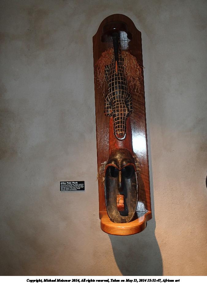 Picture #6: African art #7 675x923, 81,543 bytes (80K), (html file) Copyright, Michael Meissner 2014, All rights reserved Olympus TG-2 camera f/2.0, ISO 200, flash, 1/30 sec, 4.5mm, auto mode, HQ, matrix metering, image stabilization (mode 2), noise filter n/a 35mm equivalent focal length 25.0mm Programs used: crop, raw therapee, rotate left Taken by Michael Meissner on May 13, 2014 15:51:47 Last modified on October 26, 2014 at 13:33 |