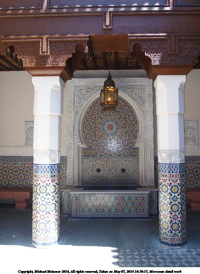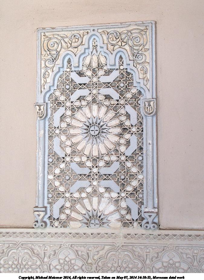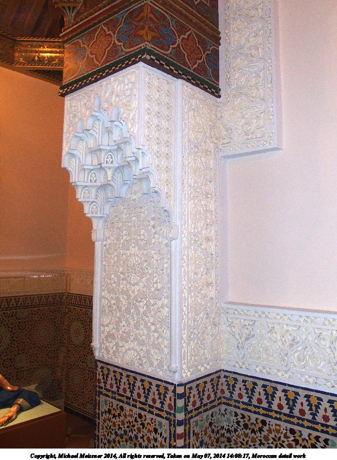 Picture #122: Morrocan detail work 675x923, 138,601 bytes (136K), (html file) Copyright, Michael Meissner 2014, All rights reserved Olympus Stylus-1 camera f/2.8, ISO 320, flash (+0.33 flash compensation), 1/50 sec, 10.8mm, auto mode, vivid color, SHQ, matrix metering, IS Auto, noise reduction auto, noise filter low 35mm equivalent focal length 50.0mm Programs used: crop, raw therapee, rotate left Taken by Michael Meissner on May 07, 2014 14:09:46 Last modified on October 25, 2014 at 18:51 |
