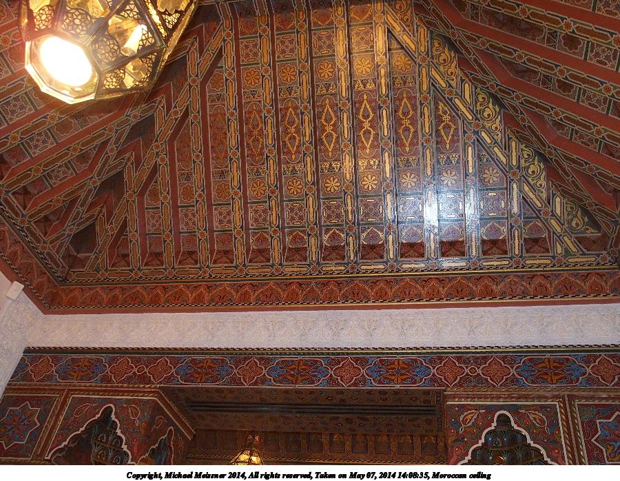 Picture #123: Moroccan ceiling 900x698, 205,195 bytes (201K), (html file) Copyright, Michael Meissner 2014, All rights reserved Olympus Stylus-1 camera f/2.8, ISO 500, flash (+0.33 flash compensation), 1/30 sec, 6.0mm, auto mode, vivid color, SHQ, matrix metering, IS Auto, noise reduction auto, noise filter low 35mm equivalent focal length 28.0mm Programs used: crop, raw therapee Taken by Michael Meissner on May 07, 2014 14:08:35 Last modified on October 25, 2014 at 18:50 |