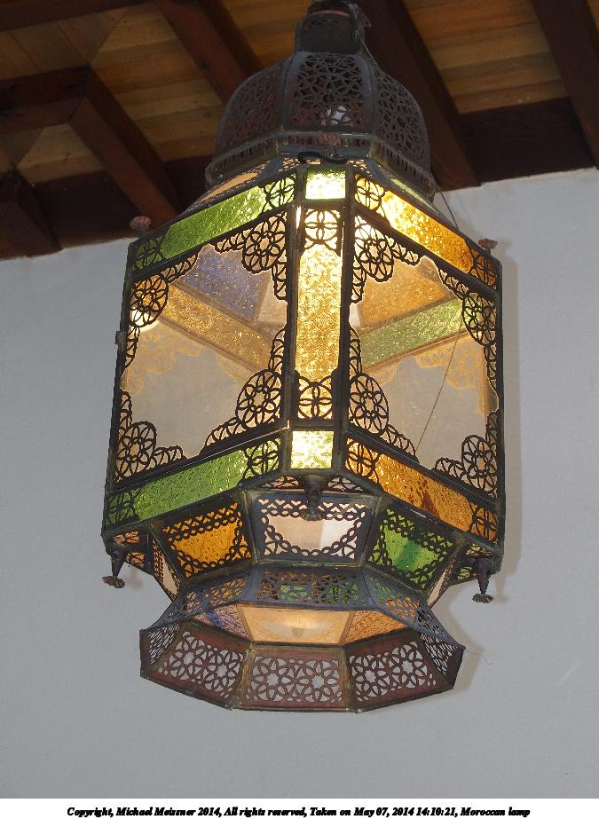 Picture #120: Moroccan lamp 675x923, 127,991 bytes (125K), (html file) Copyright, Michael Meissner 2014, All rights reserved Olympus Stylus-1 camera f/2.8, ISO 200, flash (+0.33 flash compensation), 1/160 sec, 16.1mm, auto mode, vivid color, SHQ, matrix metering, IS Auto, noise reduction auto, noise filter low 35mm equivalent focal length 76.0mm Programs used: crop, raw therapee, rotate left Taken by Michael Meissner on May 07, 2014 14:10:21 Last modified on October 25, 2014 at 18:51 |