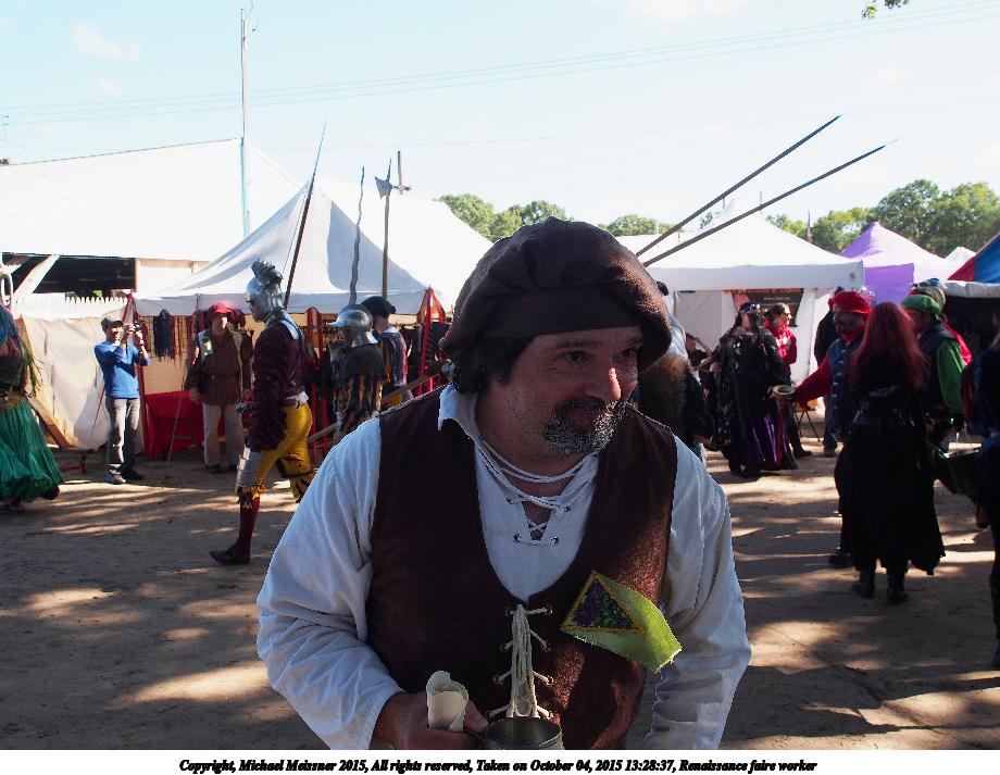 Picture #4: Renaissance faire worker Small: 920x713, 114,682 bytes (112K), (html file) Large: 4600x3450, 6,358,202 bytes (6.1M), (html file) Copyright, Michael Meissner 2015, All rights reserved Olympus E-M5-I camera with Olympus-m43 12-40mm f/2.8 lens f/5.6, ISO 200, 1/250 sec, 17.0mm, auto mode, vivid color, matrix metering, IS1 (All Direction Shake IS), noise filter low 35mm equivalent focal length 34.0mm Programs used: crop, gimp, raw therapee Taken by Michael Meissner on October 04, 2015 13:28:37 Last modified on December 19, 2015 at 22:00 |