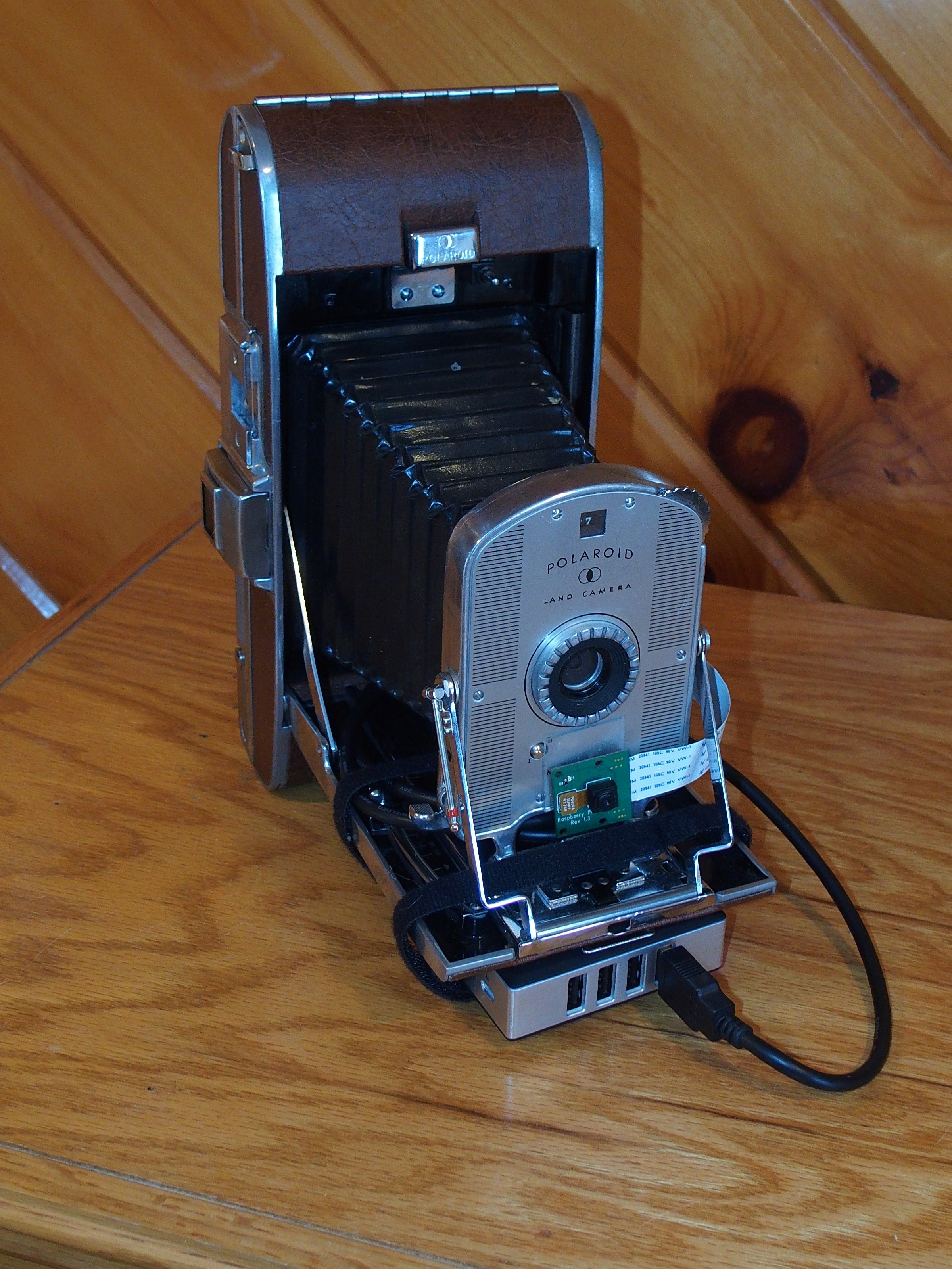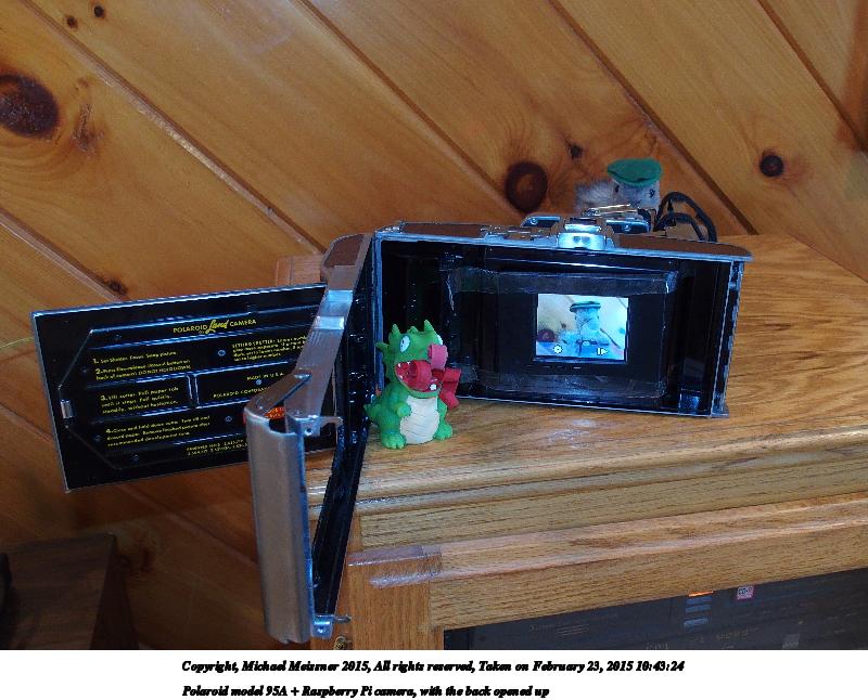 Picture #3: Polaroid model 95A + Raspberry Pi camera, with the back opened up Thumb: 400x300, 36,680 bytes (36K) Small: 800x646, 103,082 bytes (101K), (html file) Large: 3200x2400, 2,371,393 bytes (2.3M), (html file) Copyright, Michael Meissner 2015, All rights reserved Olympus Stylus-1 camera f/2.8, ISO 400, flash, 1/30 sec, 6.0mm, auto mode, vivid color, matrix metering, IS Auto, noise reduction auto, noise filter low 35mm equivalent focal length 28.0mm Programs used: crop, raw therapee Taken by Michael Meissner on February 23, 2015 10:43:24 Last modified on February 23, 2015 at 11:17 |