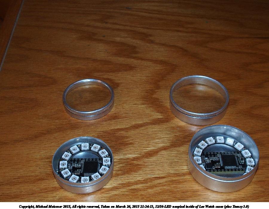 Picture #1: 12/16-LED neopixel inside of Lee Watch cases (plus Teensy 3.0) Thumb: 450x338, 40,127 bytes (40K) Small: 900x698, 120,228 bytes (118K), (html file) Large: 3600x2700, 3,273,246 bytes (3.1M), (html file) Copyright, Michael Meissner 2015, All rights reserved Olympus Stylus-1 camera f/5.6, ISO 400, flash, 1/50 sec, 9.8mm, aperture priority, vivid color, matrix metering, IS Auto, noise reduction auto, noise filter low 35mm equivalent focal length 46.0mm Programs used: crop, raw therapee Taken by Michael Meissner on March 26, 2015 21:24:13 Last modified on March 26, 2015 at 23:49 |