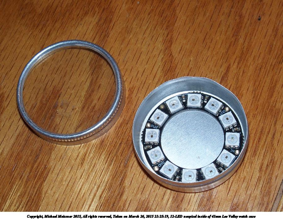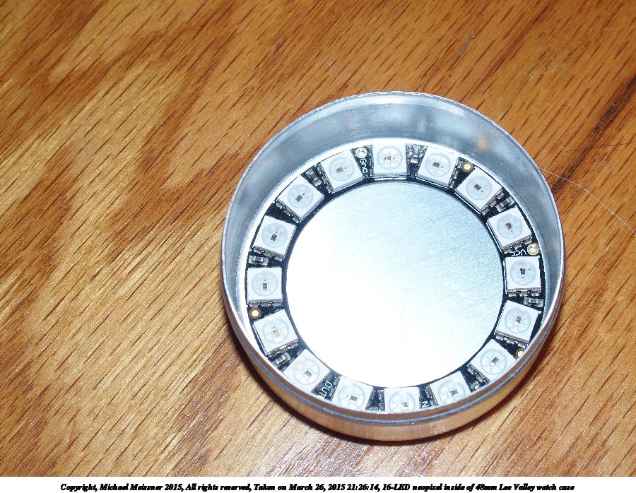 Picture #2: 12-LED neopixel inside of 41mm Lee Valley watch case Thumb: 450x338, 51,344 bytes (51K) Small: 900x698, 173,980 bytes (170K), (html file) Large: 3600x2700, 3,688,355 bytes (3.5M), (html file) Copyright, Michael Meissner 2015, All rights reserved Olympus Stylus-1 camera f/5.6, ISO 400, flash, 1/60 sec, 14.5mm, aperture priority, vivid color, matrix metering, IS Auto, noise reduction auto, noise filter low 35mm equivalent focal length 70.0mm Programs used: crop, raw therapee Taken by Michael Meissner on March 26, 2015 21:25:19 Last modified on March 26, 2015 at 23:50 |