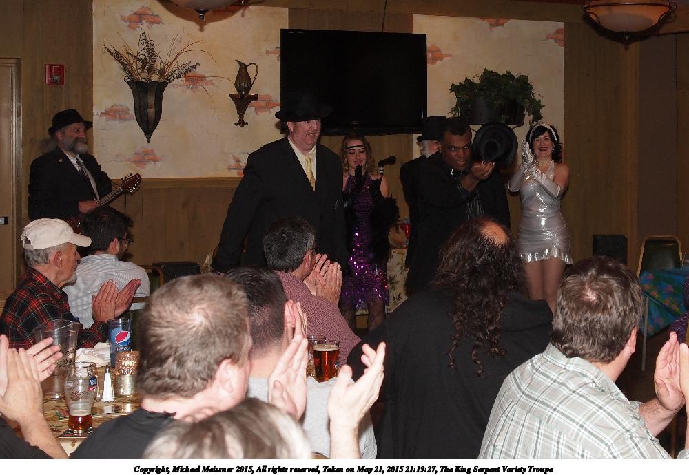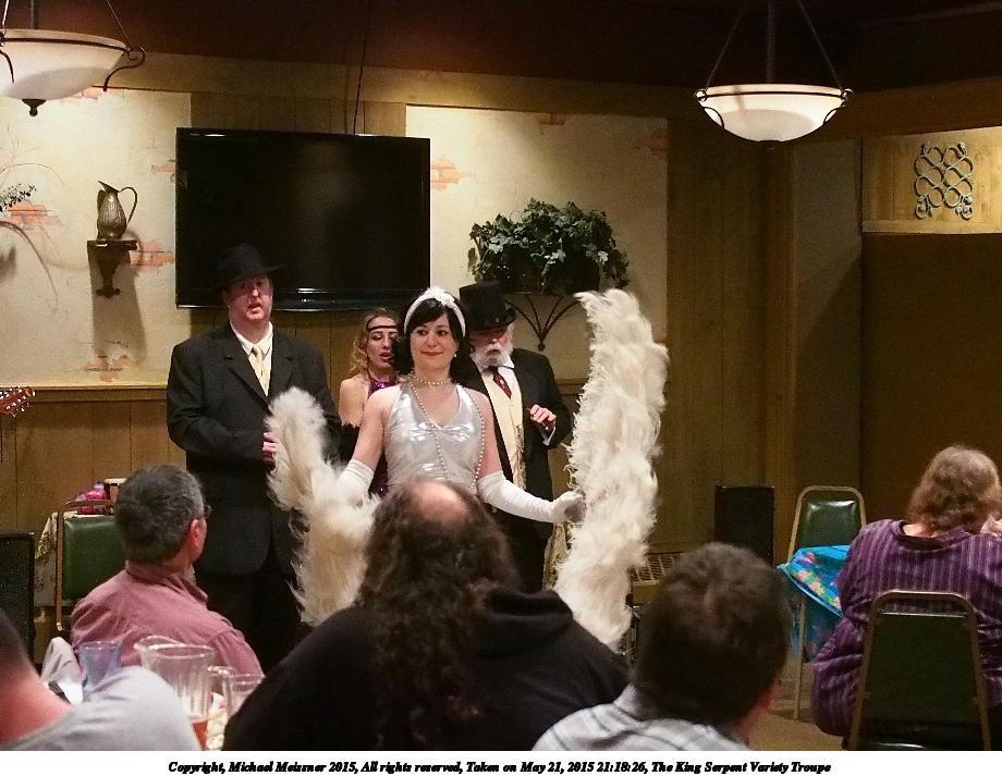 Picture #43: The King Serpent Variety Troupe Small: 920x713, 112,812 bytes (111K), (html file) Large: 4600x3450, 10,054,445 bytes (9.6M), (html file) Copyright, Michael Meissner 2015, All rights reserved Olympus E-M5-I camera with Panasonic 20mm lens f/1.7, ISO 3200, 1/60 sec, 20.0mm, auto mode, vivid color, matrix metering, digital zoom x2, IS1 (All Direction Shake IS), noise filter low 35mm equivalent focal length 80.0mm, digital zoom x2 Programs used: crop, raw therapee Taken by Michael Meissner on May 21, 2015 21:18:26 Last modified on June 12, 2015 at 23:16 |