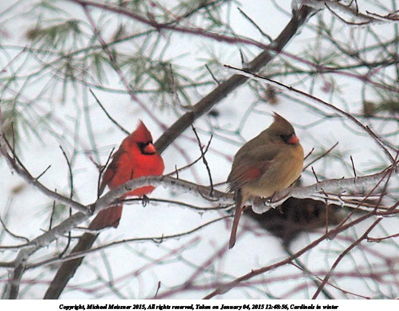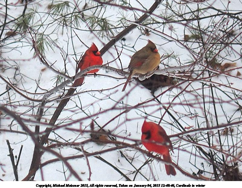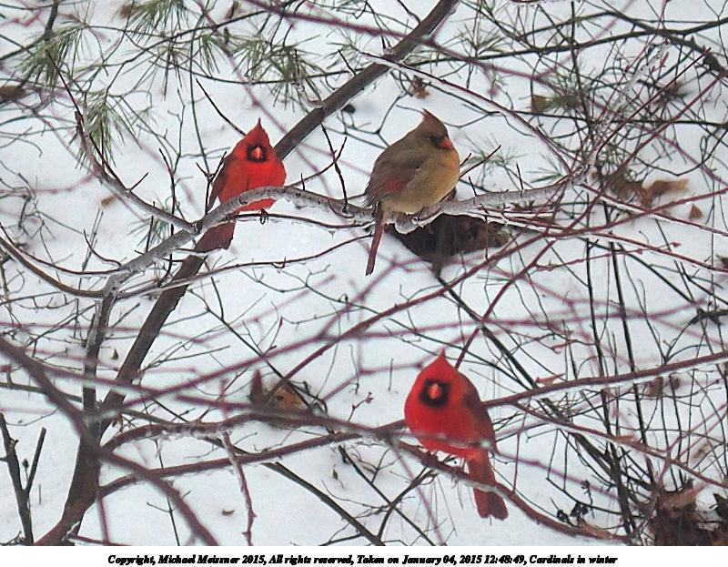 Picture #2: Cardinals in winter #2 Thumb: 480x360, 82,036 bytes (81K) Small: 800x623, 148,482 bytes (146K), (html file) Copyright, Michael Meissner 2015, All rights reserved Olympus Stylus-1 camera f/2.8, ISO 125, 1/250 sec, 31.8mm, auto mode, vivid color, SHQ, matrix metering, digital zoom x2, IS Auto, noise reduction auto, noise filter low 35mm equivalent focal length 300.0mm, digital zoom x2 Programs used: crop, gimp, raw therapee Taken by Michael Meissner on January 04, 2015 12:48:49 Last modified on January 15, 2015 at 10:38 |