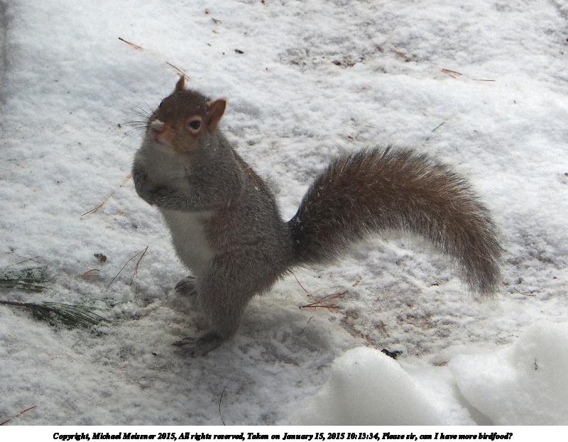 Picture #1: Please sir, can I have more birdfood? Thumb: 480x360, 43,016 bytes (43K) Small: 800x623, 98,085 bytes (96K), (html file) Copyright, Michael Meissner 2015, All rights reserved Olympus E-M5-I camera with Olympus-m43 12-50mm f/3.5-6.3 lens f/7.1, ISO 200, 1/125 sec, 50.0mm, auto mode, vivid color, matrix metering, IS1 (All Direction Shake IS), noise filter low 35mm equivalent focal length 100.0mm Programs used: crop, raw therapee Taken by Michael Meissner on January 15, 2015 10:13:34 Last modified on January 15, 2015 at 10:42 |