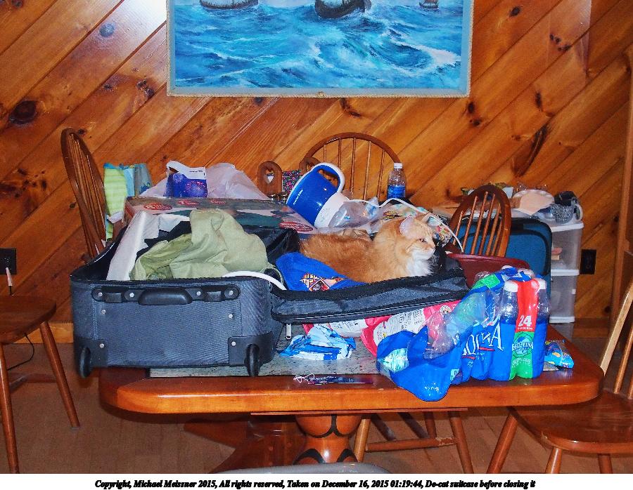 Picture #30: De-cat suitcase before closing it 900x698, 156,884 bytes (154K), (html file) Copyright, Michael Meissner 2015, All rights reserved Olympus Stylus-1 camera f/2.8, ISO 800, flash, 1/50 sec, 12.0mm, auto mode, vivid color, SHQ, matrix metering, IS Auto, noise reduction auto, noise filter low 35mm equivalent focal length 57.0mm Programs used: crop, raw therapee Taken by Michael Meissner on December 16, 2015 01:19:44 Last modified on December 16, 2015 at 08:08 |