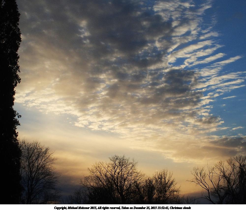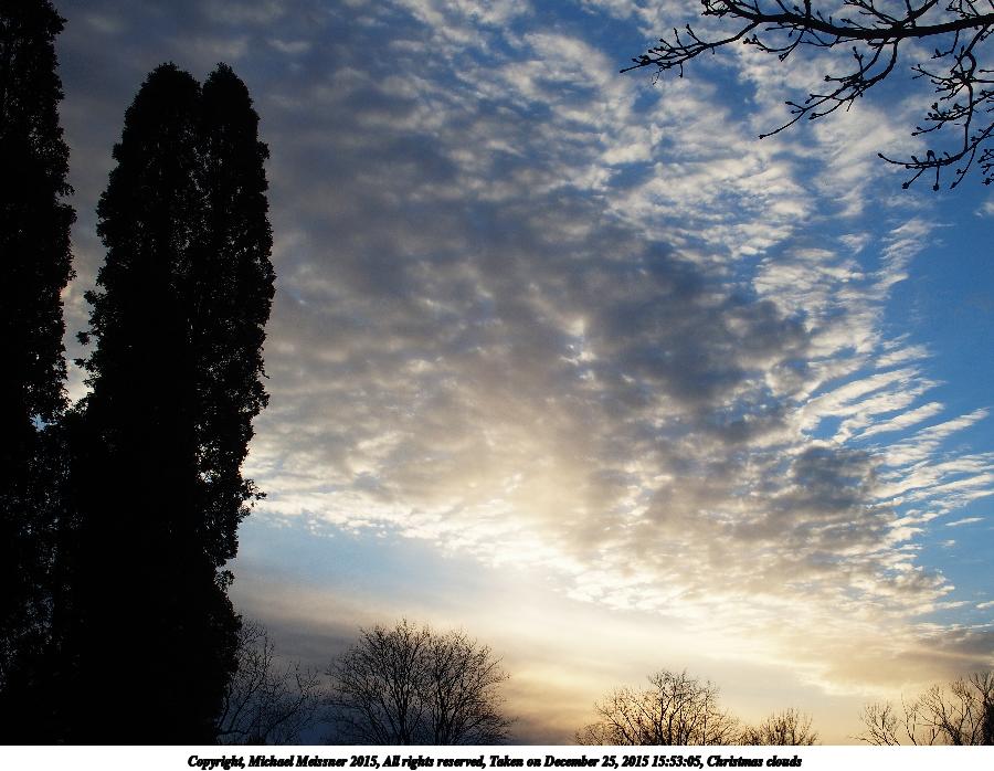 Picture #16: Christmas clouds #3 900x698, 114,428 bytes (112K), (html file) Copyright, Michael Meissner 2015, All rights reserved Olympus Stylus-1 camera f/4.5, ISO 100, 1/800 sec, 10.8mm, auto mode, vivid color, SHQ, matrix metering, IS Auto, noise reduction auto, noise filter low 35mm equivalent focal length 50.0mm Programs used: crop, raw therapee Taken by Michael Meissner on December 25, 2015 15:53:05 Last modified on December 29, 2015 at 22:17 |