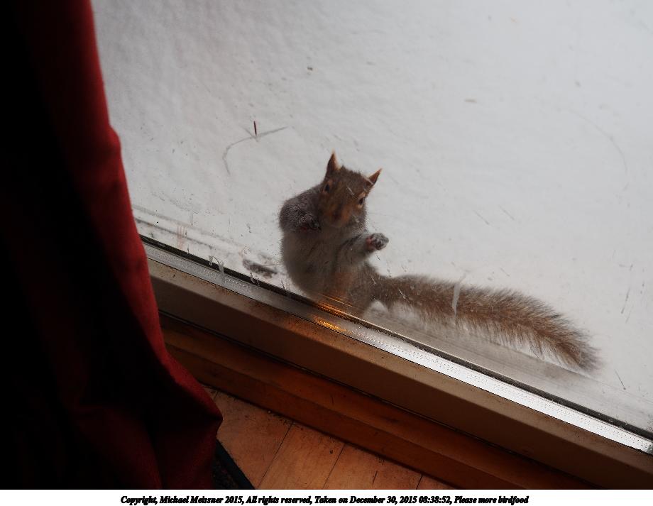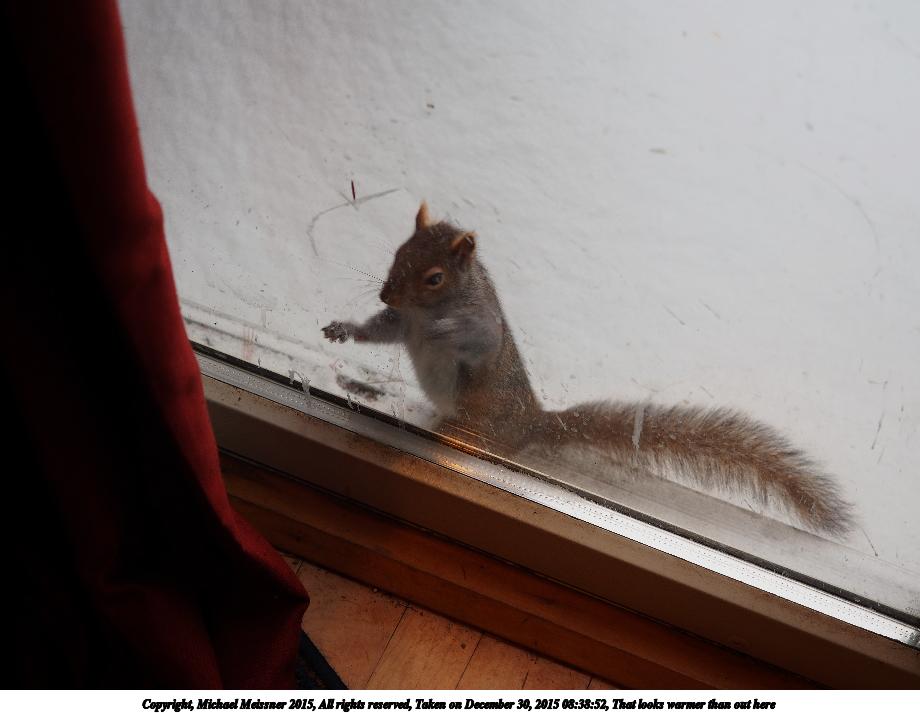 Picture #29: Let me in, NOW! 800x556, 90,413 bytes (89K), (html file) Copyright, Michael Meissner 2015, All rights reserved Olympus Stylus-1 camera f/2.8, ISO 320, 1/60 sec, 13.2mm, auto mode, vivid color, SHQ, matrix metering, IS Auto, noise reduction auto, noise filter low 35mm equivalent focal length 62.0mm Programs used: crop, raw therapee Taken by Michael Meissner on December 16, 2015 08:00:10 Last modified on December 16, 2015 at 08:08 |