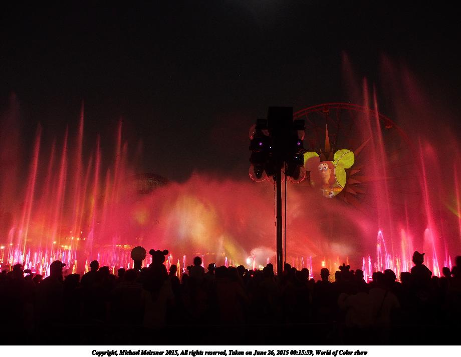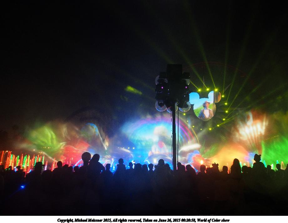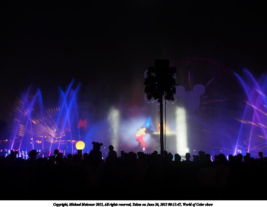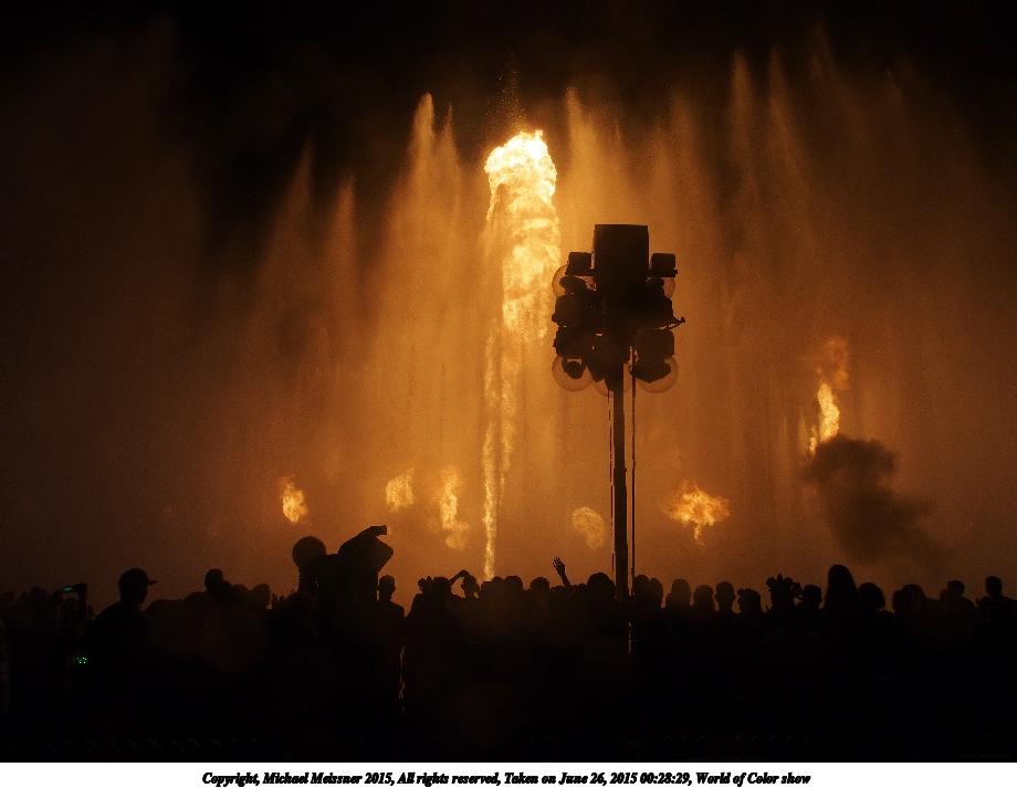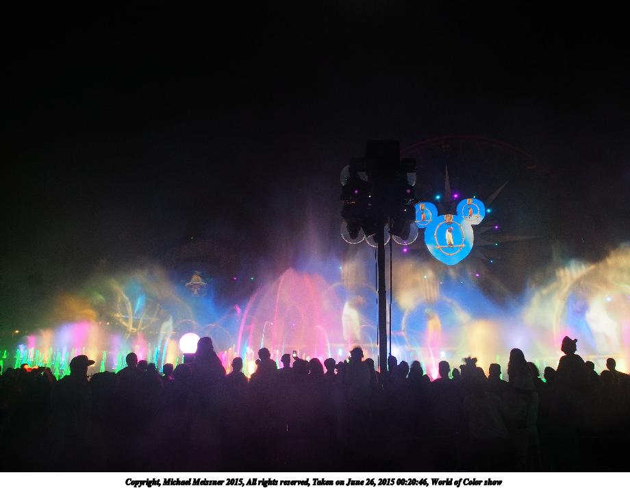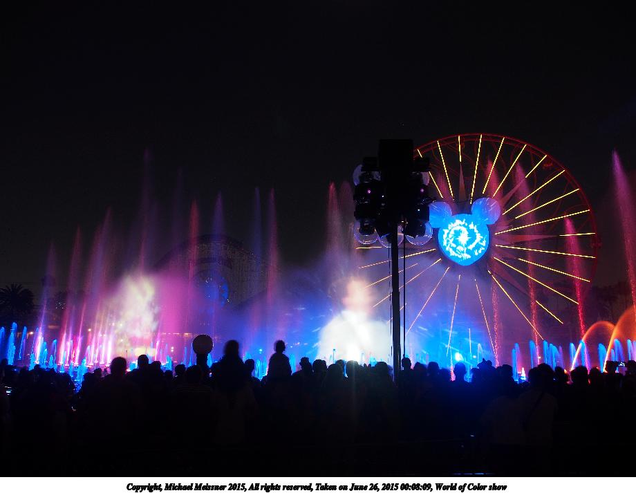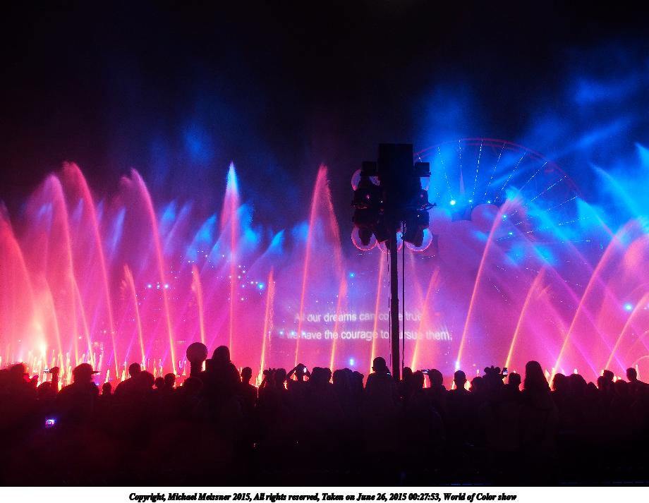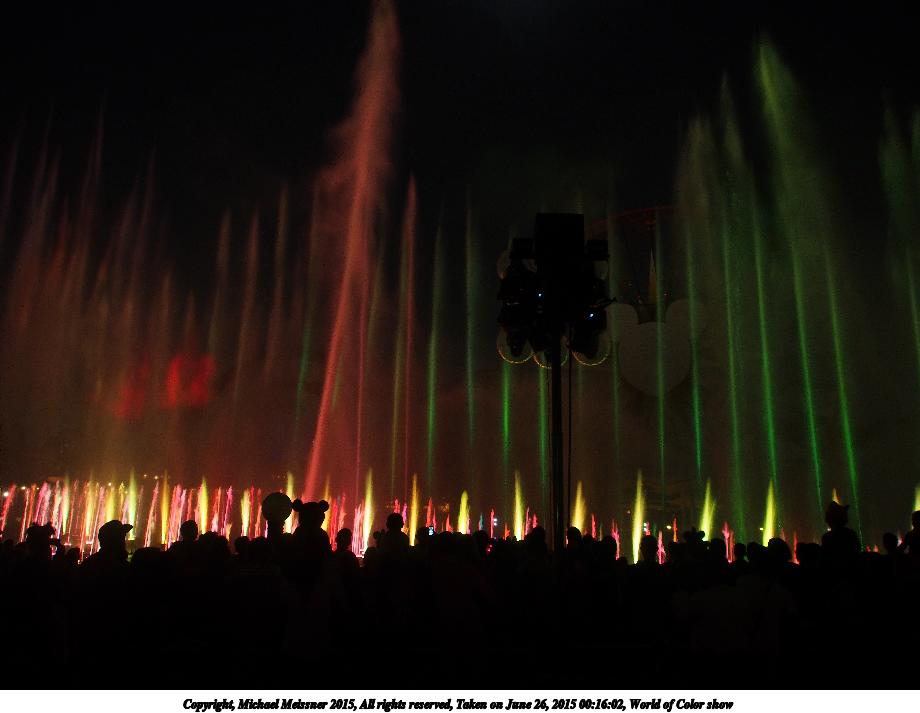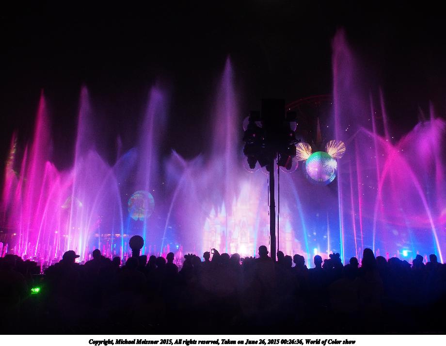 Picture #2: World of Color show #18 920x713, 81,481 bytes (80K), (html file) Copyright, Michael Meissner 2015, All rights reserved Olympus E-M5-I camera with Olympus-m43 12-50mm f/3.5-6.3 lens f/3.5, ISO 800, 1/8 sec, 12.0mm, auto mode, vivid color, matrix metering, IS1 (All Direction Shake IS), noise filter low 35mm equivalent focal length 24.0mm Programs used: crop, raw therapee Taken by Michael Meissner on June 26, 2015 00:27:53 Last modified on August 26, 2015 at 08:46 |