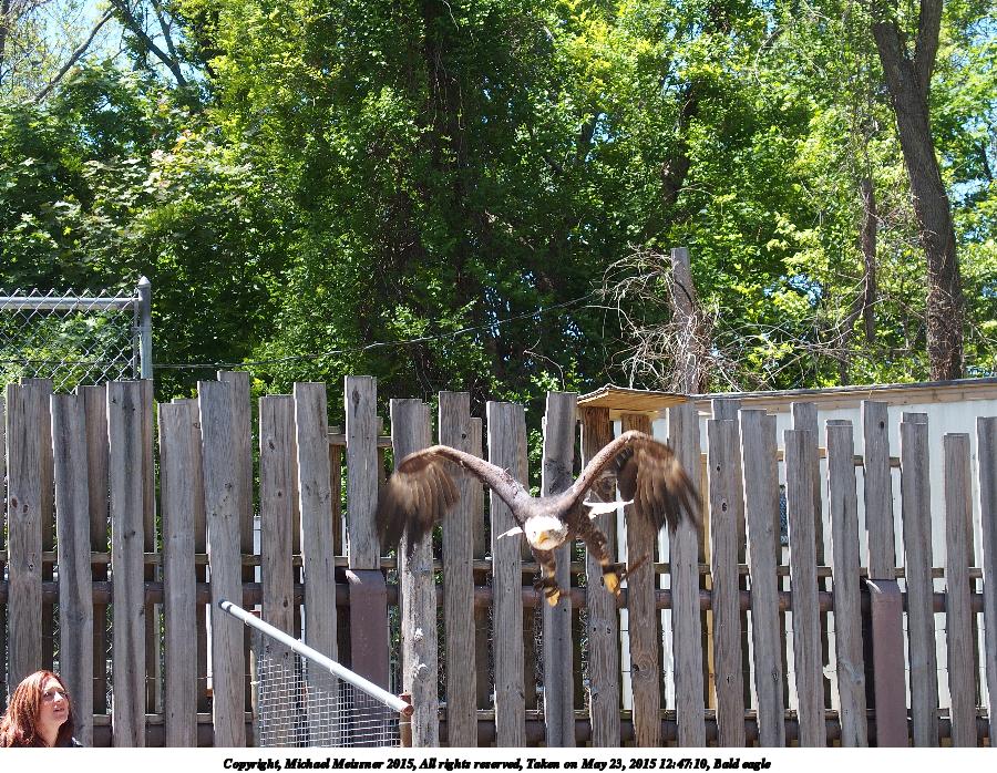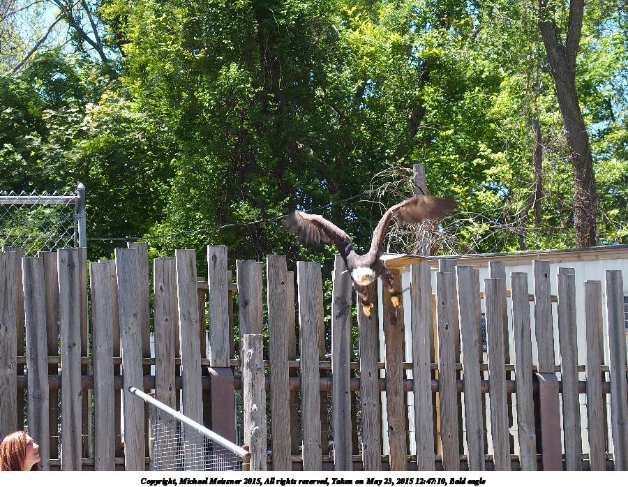 Picture #12: Bald eagle #2 Thumb: 400x300, 67,075 bytes (66K) Small: 800x623, 175,637 bytes (172K), (html file) Copyright, Michael Meissner 2015, All rights reserved Olympus Stylus-1 camera f/3.5, ISO 100, 1/320 sec, 24.0mm, auto mode, vivid color, SHQ, matrix metering, IS Auto, noise filter low 35mm equivalent focal length 112.0mm Programs used: crop, gimp, raw therapee Taken by Michael Meissner on May 23, 2015 12:47:09 Last modified on May 24, 2015 at 23:07 The file originally appeared in http://www.the-meissners.org/2015-small-albums/2015-stone-zoo/index.html. |