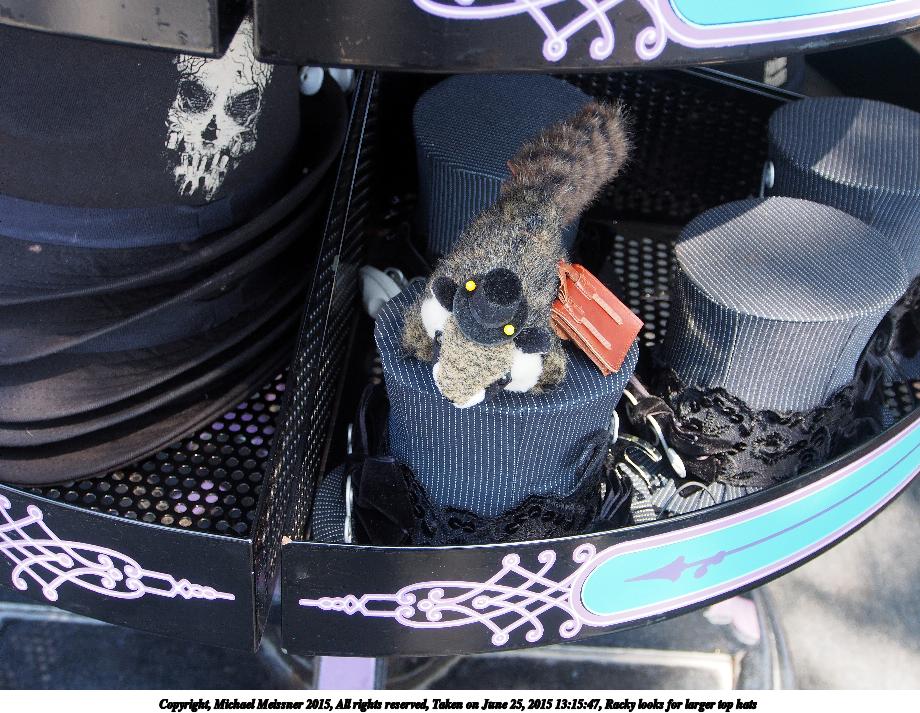 Picture #8: Racky looks for larger top hats Thumb: 460x345, 55,877 bytes (55K) Small: 920x713, 162,622 bytes (159K), (html file) Copyright, Michael Meissner 2015, All rights reserved Olympus E-M5-I camera with Olympus-m43 12-50mm f/3.5-6.3 lens f/5.2, ISO 640, 1/60 sec, 27.0mm, auto mode, vivid color, matrix metering, IS1 (All Direction Shake IS), noise filter low 35mm equivalent focal length 54.0mm Programs used: crop, raw therapee Taken by Michael Meissner on June 25, 2015 13:15:47 Last modified on July 03, 2015 at 20:18 The file originally appeared in http://www.the-meissners.org/2015-small-albums/2015-disneyland/index.html. |