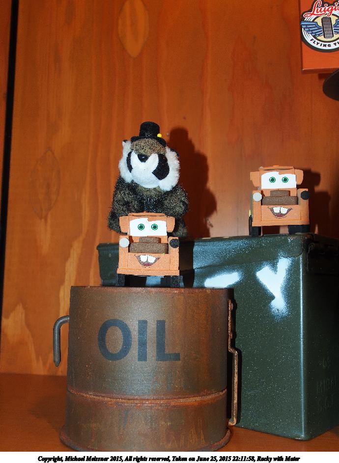 Picture #15: Racky with Mater Thumb: 345x460, 41,520 bytes (41K) Small: 690x943, 107,231 bytes (105K), (html file) Copyright, Michael Meissner 2015, All rights reserved Olympus E-M5-I camera with Olympus-m43 12-50mm f/3.5-6.3 lens f/4.5, ISO 200, flash (+0.33 flash compensation), 1/60 sec, 19.0mm, auto mode, vivid color, matrix metering, IS1 (All Direction Shake IS), noise filter low 35mm equivalent focal length 38.0mm Programs used: crop, raw therapee, rotate left Taken by Michael Meissner on June 25, 2015 22:11:58 Last modified on August 26, 2015 at 08:36 The file originally appeared in http://www.the-meissners.org/2015-small-albums/2015-disney-dca/index.html. |