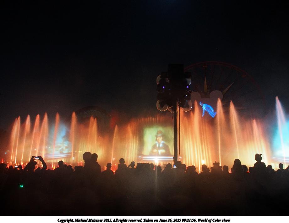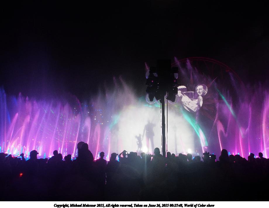 Picture #2: World of Color show #2 Thumb: 460x345, 33,095 bytes (33K) Small: 920x713, 65,496 bytes (64K), (html file) Copyright, Michael Meissner 2015, All rights reserved Olympus E-M5-I camera with Olympus-m43 12-50mm f/3.5-6.3 lens f/3.5, ISO 800, 1/6 sec, 12.0mm, auto mode, vivid color, matrix metering, IS1 (All Direction Shake IS), noise filter low 35mm equivalent focal length 24.0mm Programs used: crop, raw therapee Taken by Michael Meissner on June 26, 2015 00:20:46 Last modified on August 26, 2015 at 08:43 The file originally appeared in http://www.the-meissners.org/2015-small-albums/2015-disney-dca/index.html. |
