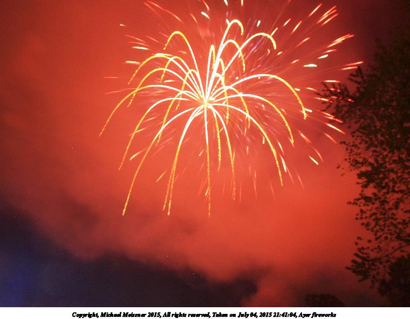Picture #6: Ayer fireworks #6 Thumb: 400x300, 37,110 bytes (37K) Small: 800x623, 73,038 bytes (72K), (html file) Copyright, Michael Meissner 2015, All rights reserved Olympus E-5 camera with Olympus 14-54mm f/2.8-3.5 lens f/5.6, ISO 200, 2.6 sec, 14.0mm, bulb mode, natural color, HQ, matrix metering, manual focus, noise filter low 35mm equivalent focal length 28.0mm Extra equipment used: Tripod, cable release Programs used: crop, gimp Taken by Michael Meissner on July 04, 2015 21:41:43 Last modified on July 10, 2015 at 00:42 The file originally appeared in http://www.the-meissners.org/2015-small-albums/2015-07/index.html. |