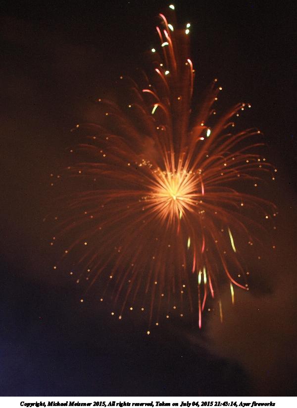 Picture #3: Ayer fireworks #3 Thumb: 400x300, 32,910 bytes (33K) Small: 800x623, 66,756 bytes (66K), (html file) Copyright, Michael Meissner 2015, All rights reserved Olympus E-5 camera with Olympus 14-54mm f/2.8-3.5 lens f/5.6, ISO 200, 1.2 sec, 14.0mm, bulb mode, natural color, HQ, matrix metering, manual focus, noise filter low 35mm equivalent focal length 28.0mm Extra equipment used: Tripod, cable release Programs used: crop, gimp Taken by Michael Meissner on July 04, 2015 21:33:23 Last modified on July 09, 2015 at 23:55 The file originally appeared in http://www.the-meissners.org/2015-small-albums/2015-07/index.html. |