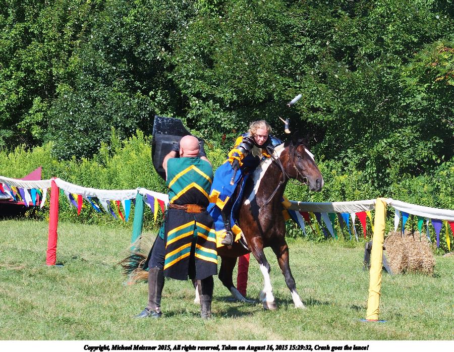 Picture #6: Crash goes the lance! Thumb: 450x338, 76,527 bytes (75K) Small: 900x698, 281,269 bytes (275K), (html file) Copyright, Michael Meissner 2015, All rights reserved Olympus Stylus-1 camera f/4.0, ISO 100, 1/640 sec, 31.8mm, auto mode, vivid color, SHQ, matrix metering, IS Auto, noise filter low 35mm equivalent focal length 150.0mm Programs used: crop, raw therapee Taken by Michael Meissner on August 16, 2015 15:29:32 Last modified on January 03, 2016 at 17:03 The file originally appeared in http://www.the-meissners.org/2015-small-albums/2015-silver-kingdom-ren/index.html. |