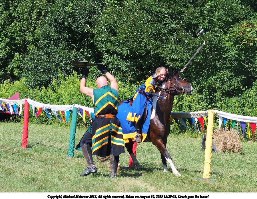 Picture #7: Crash goes the lance! #2 Thumb: 450x338, 76,487 bytes (75K) Small: 900x698, 284,681 bytes (279K), (html file) Copyright, Michael Meissner 2015, All rights reserved Olympus Stylus-1 camera f/4.0, ISO 100, 1/640 sec, 31.8mm, auto mode, vivid color, SHQ, matrix metering, IS Auto, noise filter low 35mm equivalent focal length 150.0mm Programs used: crop, raw therapee Taken by Michael Meissner on August 16, 2015 15:29:32 Last modified on January 03, 2016 at 17:03 The file originally appeared in http://www.the-meissners.org/2015-small-albums/2015-silver-kingdom-ren/index.html. |