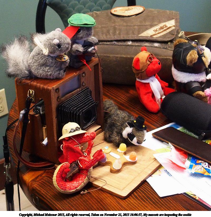 Picture #2: My mascots are inspecting the cookie #2 Thumb: 480x480, 79,886 bytes (79K) Small: 800x823, 155,393 bytes (152K), (html file) Copyright, Michael Meissner 2015, All rights reserved Olympus Stylus-1 camera f/2.8, ISO 640, 1/50 sec, 12.0mm, auto mode, vivid color, SHQ, matrix metering, IS Auto, noise reduction auto, noise filter low 35mm equivalent focal length 57.0mm Programs used: crop, rawtherapee-helper Taken by Michael Meissner on November 21, 2015 16:06:57 Last modified on November 22, 2015 at 14:20 The file originally appeared in http://www.the-meissners.org/2015-small-albums/2015-11/index.html. |