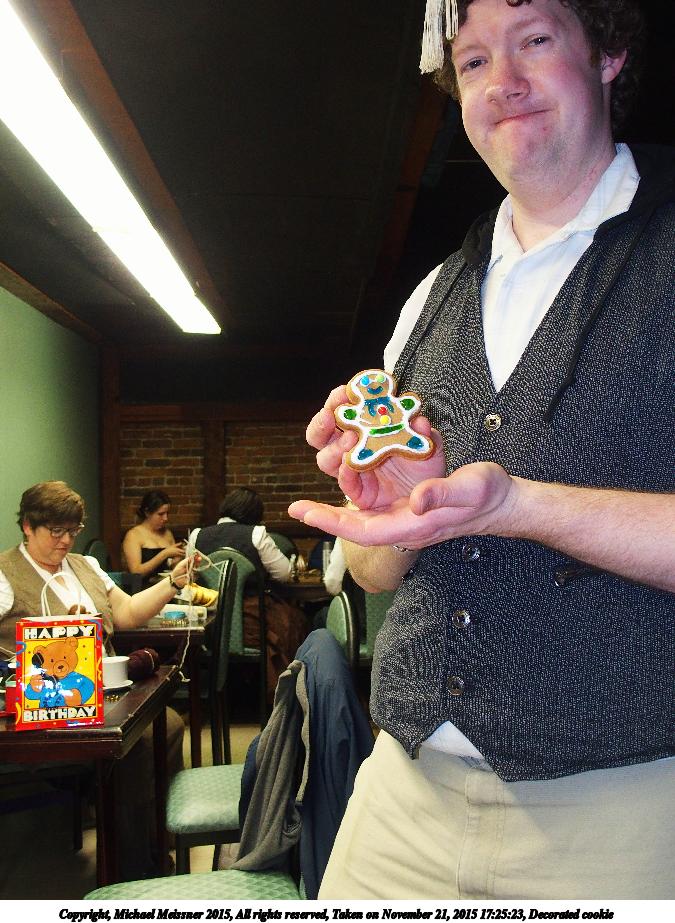 Picture #3: Decorated cookie Thumb: 338x450, 46,561 bytes (46K) Small: 675x923, 141,999 bytes (139K), (html file) Copyright, Michael Meissner 2015, All rights reserved Olympus Stylus-1 camera f/2.8, ISO 400, flash, 1/30 sec, 7.4mm, auto mode, vivid color, SHQ, matrix metering, IS Auto, noise reduction auto, noise filter low 35mm equivalent focal length 35.0mm Programs used: adjusttime, crop, raw therapee, rotate left Taken by Michael Meissner on November 21, 2015 17:25:23 Last modified on November 22, 2015 at 14:20 The file originally appeared in http://www.the-meissners.org/2015-small-albums/2015-11/index.html. |