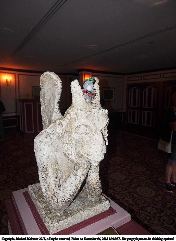 Picture #19: The gargoyle put on his thinking squirrel Thumb: 345x460, 37,843 bytes (37K) Small: 690x943, 121,480 bytes (119K), (html file) Copyright, Michael Meissner 2015, All rights reserved Olympus E-M5-I camera with Olympus-m43 12-40mm f/2.8 lens f/2.8, ISO 200, flash (+0.33 flash compensation), 1/60 sec, 12.0mm, auto mode, vivid color, matrix metering, IS1 (All Direction Shake IS), noise filter low 35mm equivalent focal length 24.0mm Programs used: crop, raw therapee Taken by Michael Meissner on December 04, 2015 13:15:51 Last modified on December 17, 2015 at 09:51 The file originally appeared in http://www.the-meissners.org/2015-small-albums/2015-wdw-stuffed/index.html. |