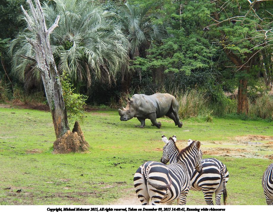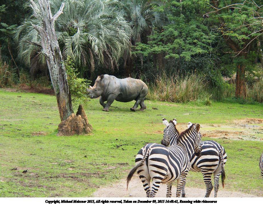 Picture #5: Running white rhinoceros Thumb: 460x345, 63,942 bytes (63K) Small: 920x713, 240,183 bytes (235K), (html file) Copyright, Michael Meissner 2015, All rights reserved Olympus E-M5-I camera with Olympus-m43 14-150mm-II f/4.0-5.6 lens f/5.6, ISO 1000, 1/500 sec, 58.0mm, shutter priority, vivid color, matrix metering, IS1 (All Direction Shake IS), noise filter low 35mm equivalent focal length 116.0mm Programs used: crop, raw therapee Taken by Michael Meissner on December 09, 2015 14:48:41 Last modified on December 17, 2015 at 22:38 The file originally appeared in http://www.the-meissners.org/2015-small-albums/2015-wdw-animal-park/index.html. |