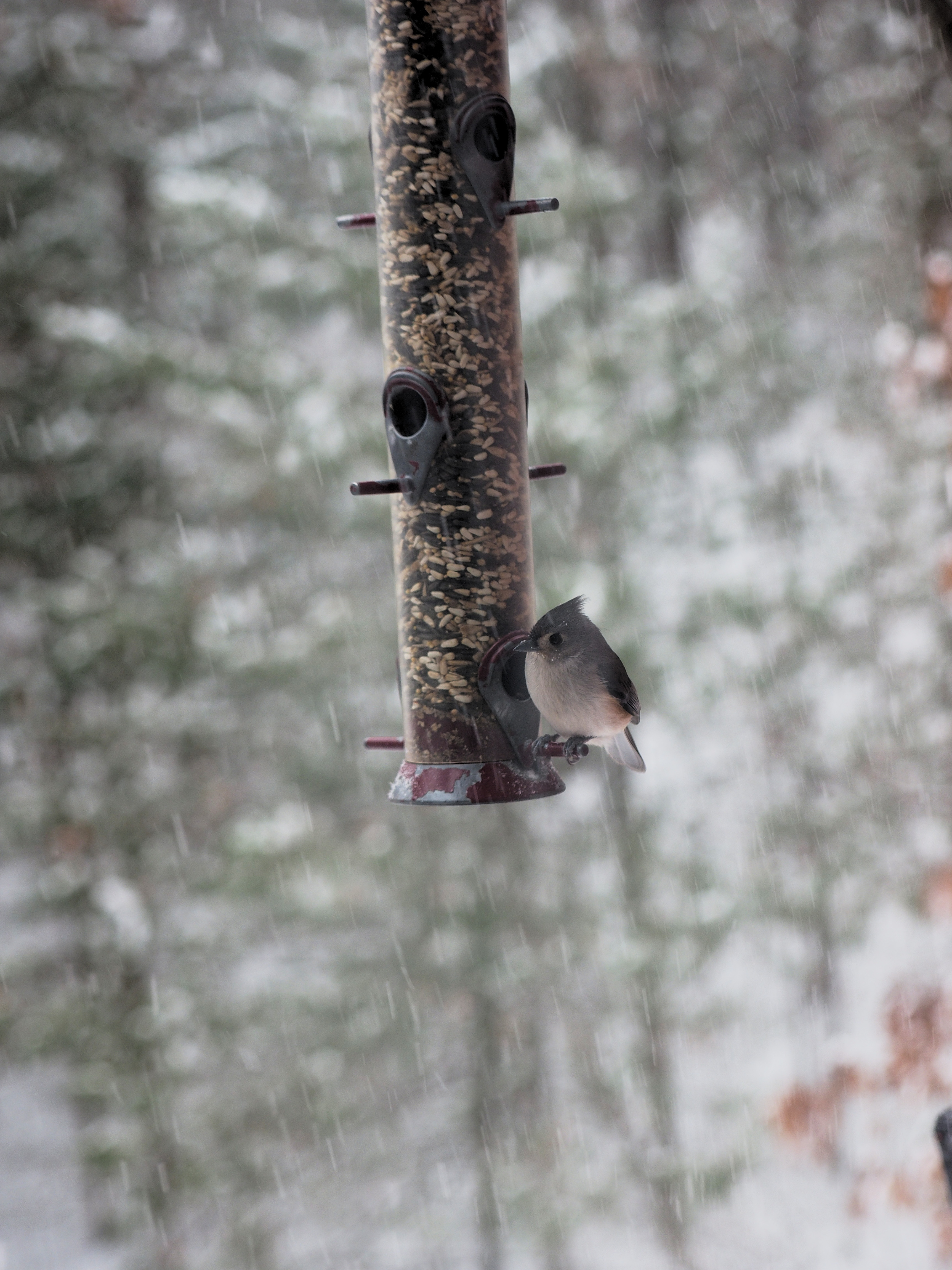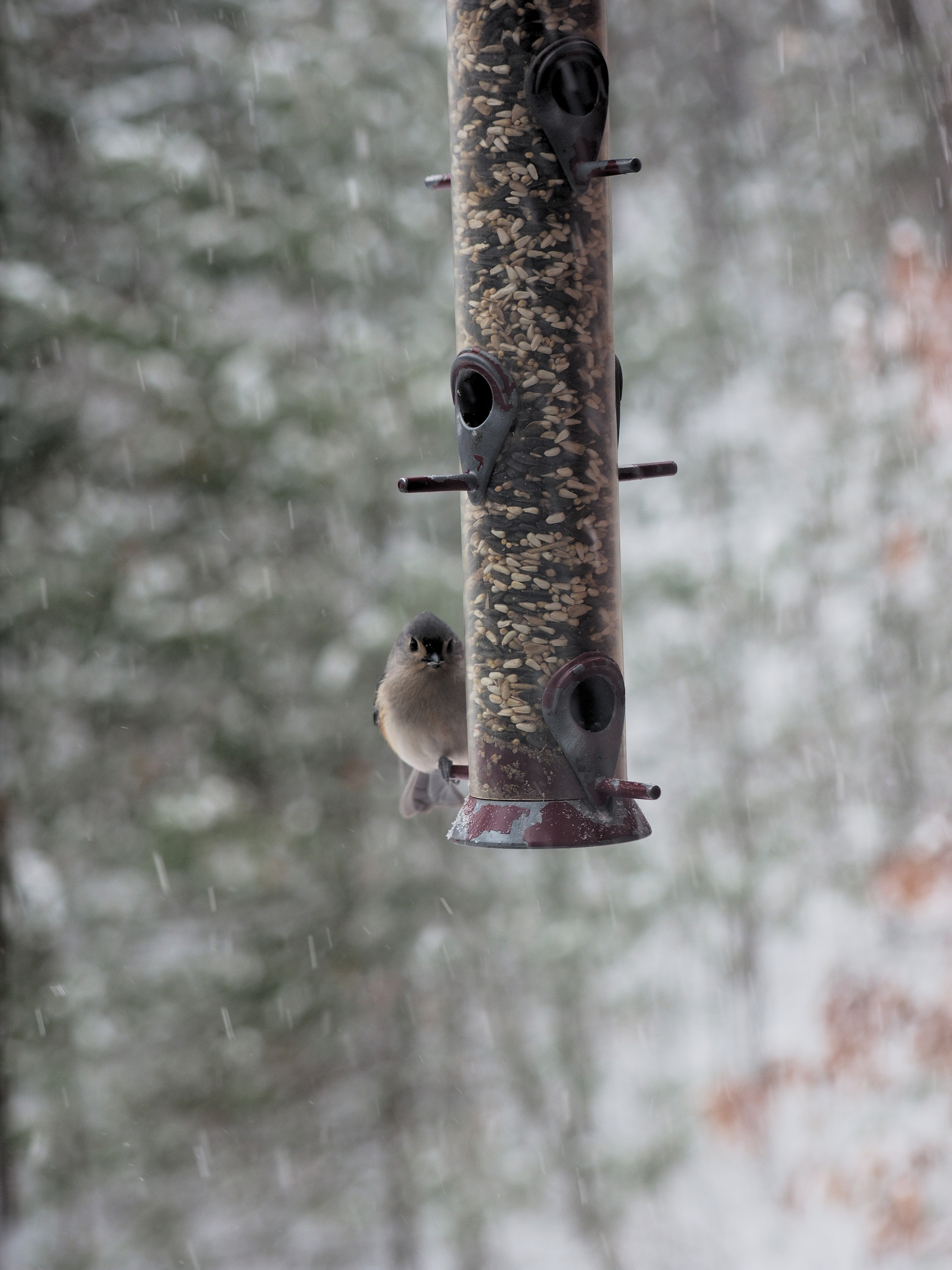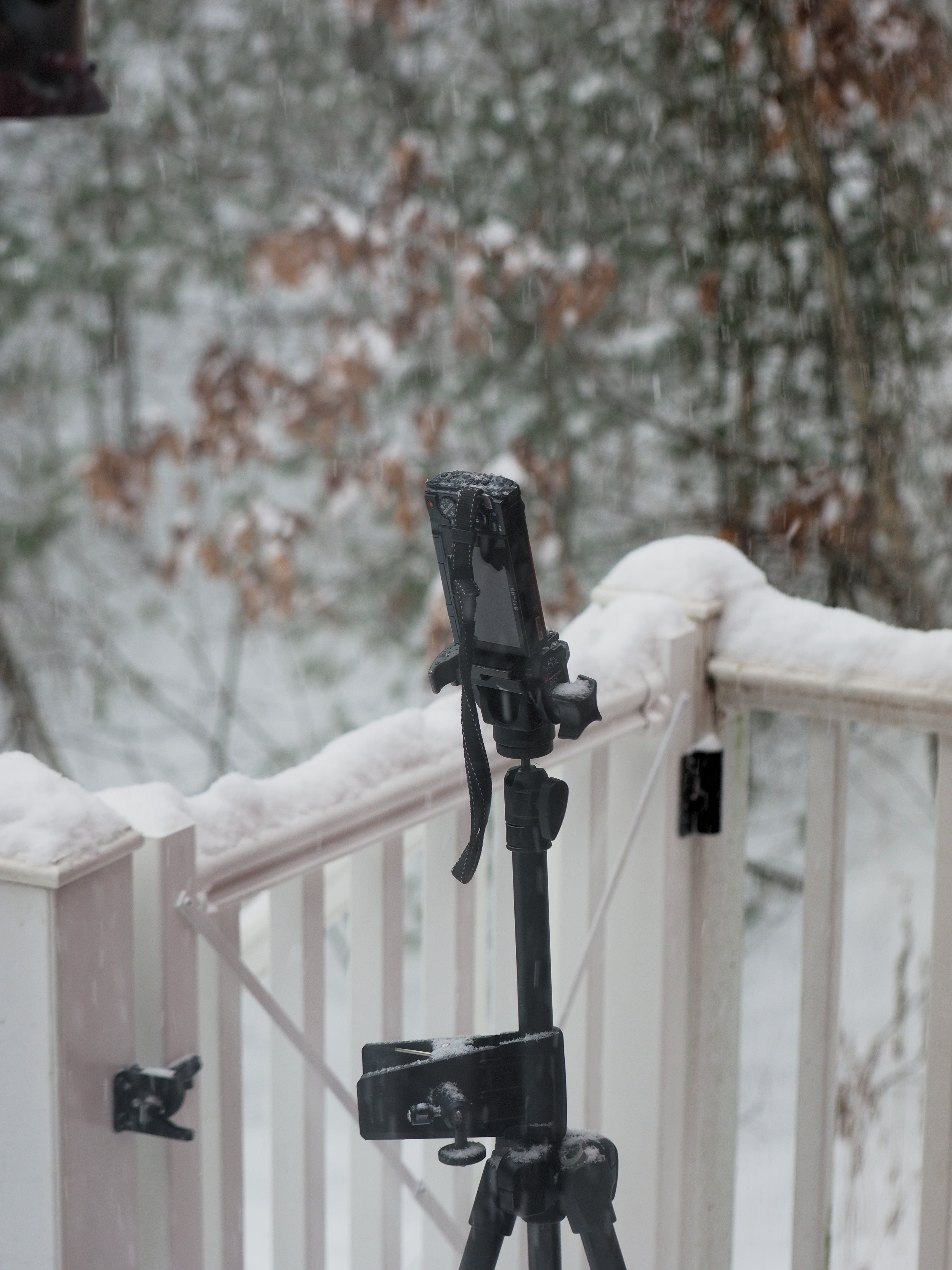 Picture #1: Setup for taking bird feeder pictures Small: 690x942, 86,677 bytes (85K), (html file) Large: 3450x4600, 2,582,158 bytes (2.5M), (html file) Copyright, Michael Meissner 2016, All rights reserved Olympus E-M1-I camera with Olympus 50-200mm lens f/3.5, ISO 200, 1/200 sec, 50.0mm, auto mode, vivid color, SHQ, matrix metering, auto + manual focus, IS Auto, noise filter low, anti-shock 35mm equivalent focal length 100.0mm Programs used: crop, raw therapee, rotate left Taken by Michael Meissner on December 17, 2016 11:51:45 Last modified on December 17, 2016 at 13:11 |