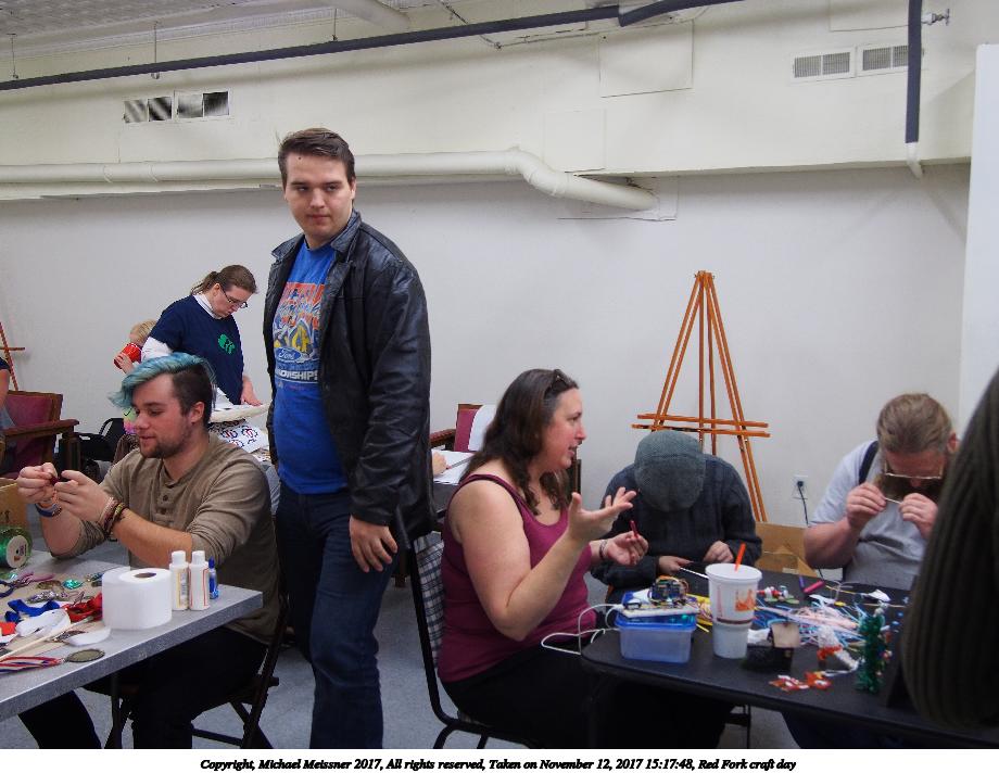 Picture #4: Red Fork craft day #3 Small: 920x712, 112,598 bytes (110K), (html file) Large: 4600x3450, 6,896,674 bytes (6.6M), (html file) Copyright, Michael Meissner 2017, All rights reserved Olympus E-PM2 camera with Olympus-m43 14-42mm-IIR f/3.5-5.6 lens f/3.5, ISO 500, 1/60 sec, 14.0mm, auto mode, vivid color, matrix metering, IS1 (All Direction Shake IS), noise filter low 35mm equivalent focal length 28.0mm Programs used: crop Taken by Michael Meissner on November 12, 2017 15:18:02 Last modified on January 06, 2017 at 08:59 |