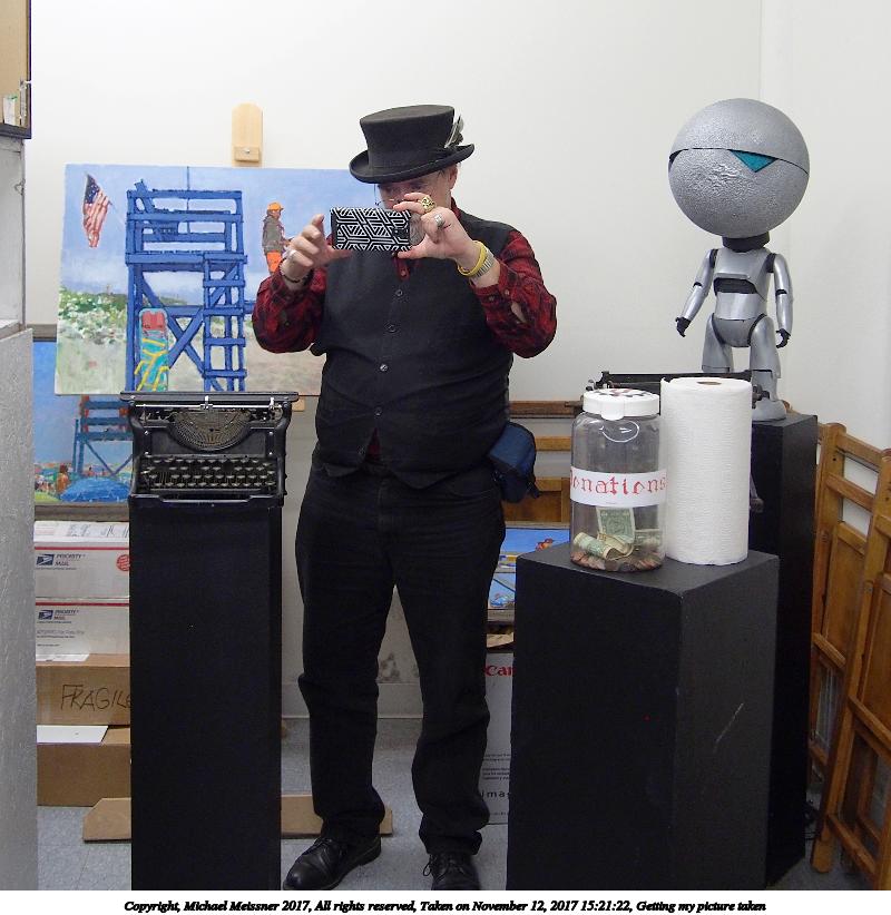 Picture #2: Getting my picture taken Small: 800x822, 97,991 bytes (96K), (html file) Large: 2400x2400, 3,854,734 bytes (3.7M), (html file) Copyright, Michael Meissner 2017, All rights reserved Olympus E-PM2 camera with Olympus-m43 14-42mm-IIR f/3.5-5.6 lens f/3.5, ISO 320, 1/60 sec, 14.0mm, auto mode, vivid color, matrix metering, IS1 (All Direction Shake IS), noise filter low 35mm equivalent focal length 28.0mm Programs used: crop, gimp Taken by Michael Meissner on November 12, 2017 15:21:22 Last modified on January 06, 2017 at 09:01 |