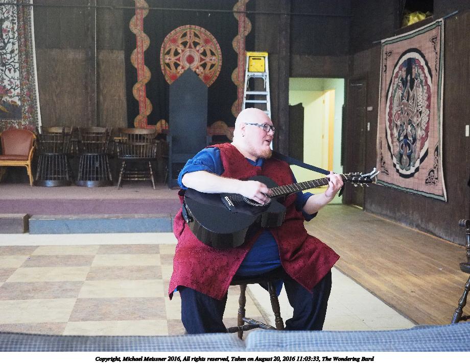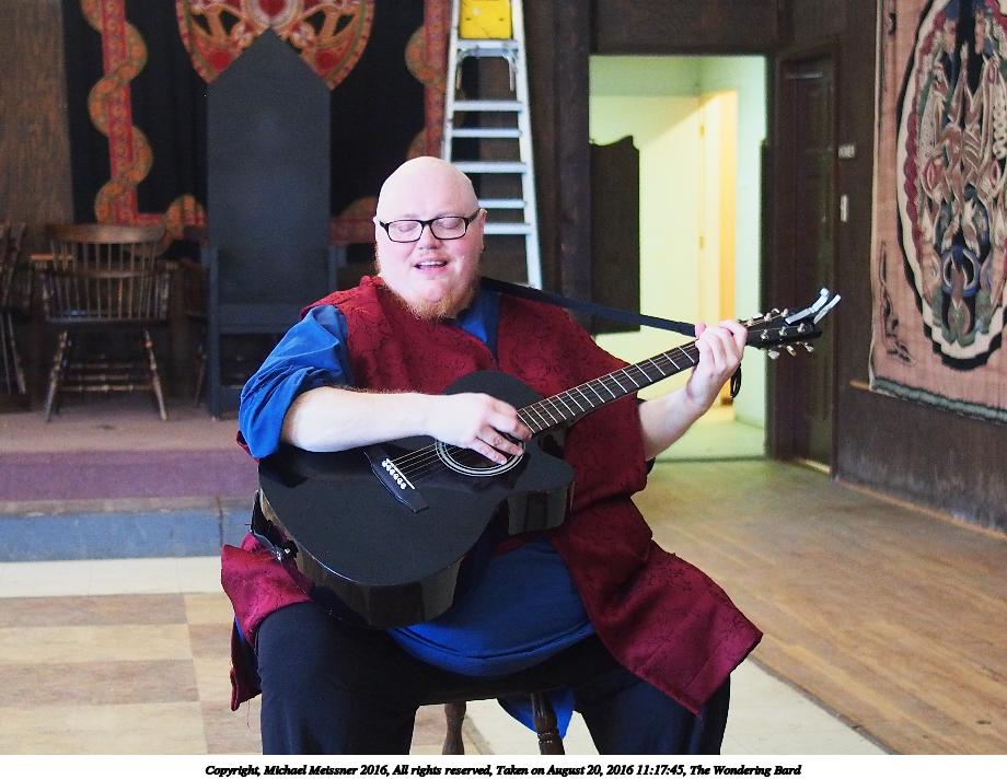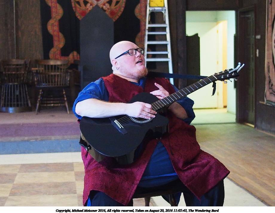 Picture #6: The Wondering Bard #6 Small: 920x712, 113,519 bytes (111K), (html file) Large: 4600x3450, 4,544,556 bytes (4.3M), (html file) Copyright, Michael Meissner 2016, All rights reserved Olympus E-M5-I camera with Panasonic 20mm lens f/1.7, ISO 1600, 1/60 sec, 20.0mm, auto mode, vivid color, matrix metering, digital zoom x2, IS1 (All Direction Shake IS), noise filter low 35mm equivalent focal length 80.0mm, digital zoom x2 Programs used: adjusttime, crop, raw therapee Taken by Michael Meissner on August 20, 2016 11:26:27 Last modified on May 05, 2017 at 18:32 |