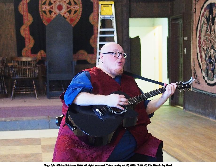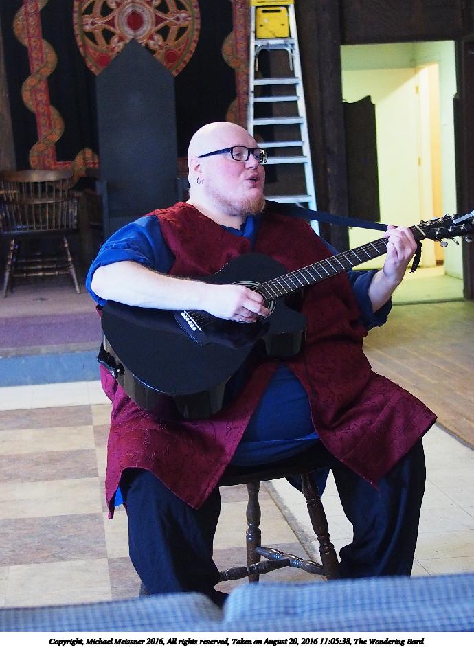 Picture #5: The Wondering Bard #5 Small: 920x712, 107,999 bytes (106K), (html file) Large: 4600x3450, 4,334,654 bytes (4.1M), (html file) Copyright, Michael Meissner 2016, All rights reserved Olympus E-M5-I camera with Panasonic 20mm lens f/1.7, ISO 1000, 1/60 sec, 20.0mm, auto mode, vivid color, matrix metering, bias -0.3, digital zoom x2, IS1 (All Direction Shake IS), noise filter low 35mm equivalent focal length 80.0mm, digital zoom x2 Programs used: adjusttime, crop, raw therapee Taken by Michael Meissner on August 20, 2016 11:17:45 Last modified on May 05, 2017 at 18:30 |