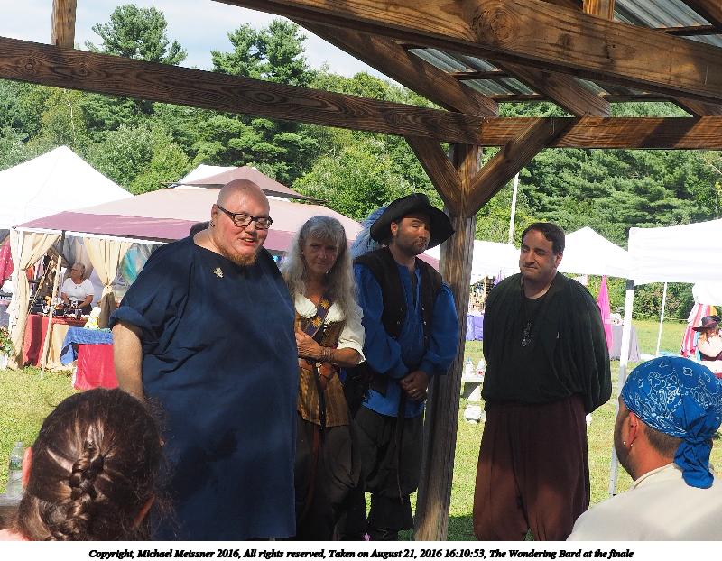 Picture #20: The Wondering Bard at the finale #2 Small: 600x844, 100,344 bytes (98K), (html file) Large: 1800x2400, 1,922,938 bytes (1.8M), (html file) Copyright, Michael Meissner 2016, All rights reserved Olympus E-M1-I camera with Olympus-m43 12-40mm f/2.8 lens f/5.0, ISO 200, 1/250 sec, 40.0mm, auto mode, vivid color, SHQ, center weight metering, bias 0.3, IS Auto, noise reduction auto, noise filter low, anti-shock 35mm equivalent focal length 80.0mm Programs used: crop, gimp, raw therapee, rotate left Taken by Michael Meissner on August 20, 2016 16:39:35 Last modified on May 04, 2017 at 18:37 |