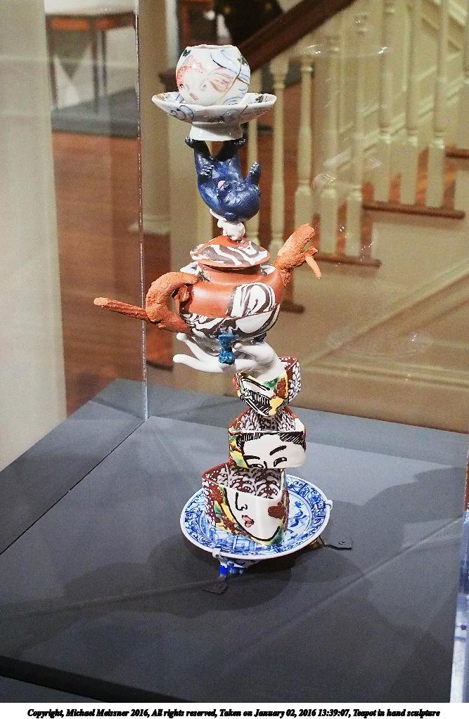 Picture #8: Teapot in hand sculpture 667x1023, 131,357 bytes (129K), (html file) Copyright, Michael Meissner 2016, All rights reserved Olympus E-M5-I camera with Olympus-m43 12-40mm f/2.8 lens f/2.8, ISO 2500, 1/60 sec, 17.0mm, auto mode, vivid color, matrix metering, IS1 (All Direction Shake IS), noise filter low 35mm equivalent focal length 34.0mm Programs used: crop, gimp, raw therapee, rotate left Taken by Michael Meissner on January 02, 2016 13:39:07 Last modified on January 02, 2016 at 23:02 |
