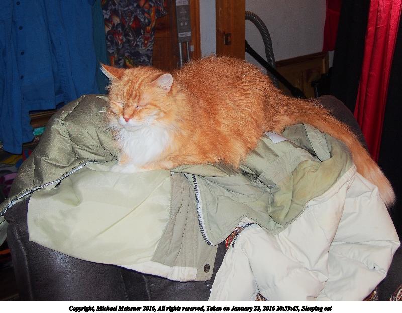 Picture #2: Sleeping cat 800x623, 92,025 bytes (90K), (html file) Copyright, Michael Meissner 2016, All rights reserved Olympus E-PM2 camera with Olympus-m43 14-42mm-IIR f/3.5-5.6 lens f/3.6, ISO 250, flash (+0.33 flash compensation), 1/60 sec, 16.0mm, auto mode, vivid color, matrix metering, IS1 (All Direction Shake IS), noise filter low 35mm equivalent focal length 32.0mm Programs used: crop, raw therapee Taken by Michael Meissner on January 23, 2016 20:59:45 Last modified on February 05, 2016 at 14:42 |
