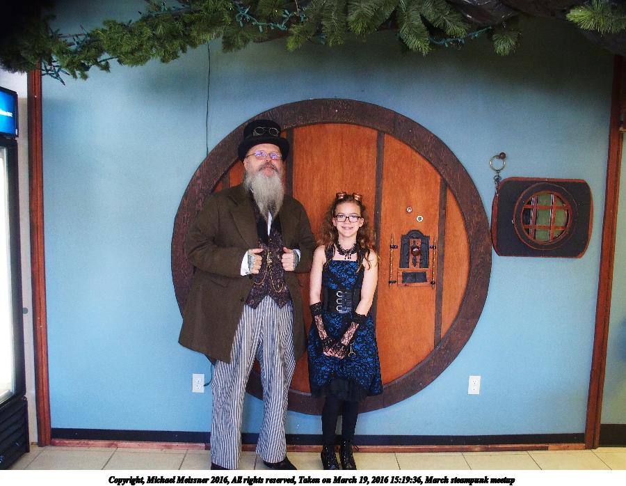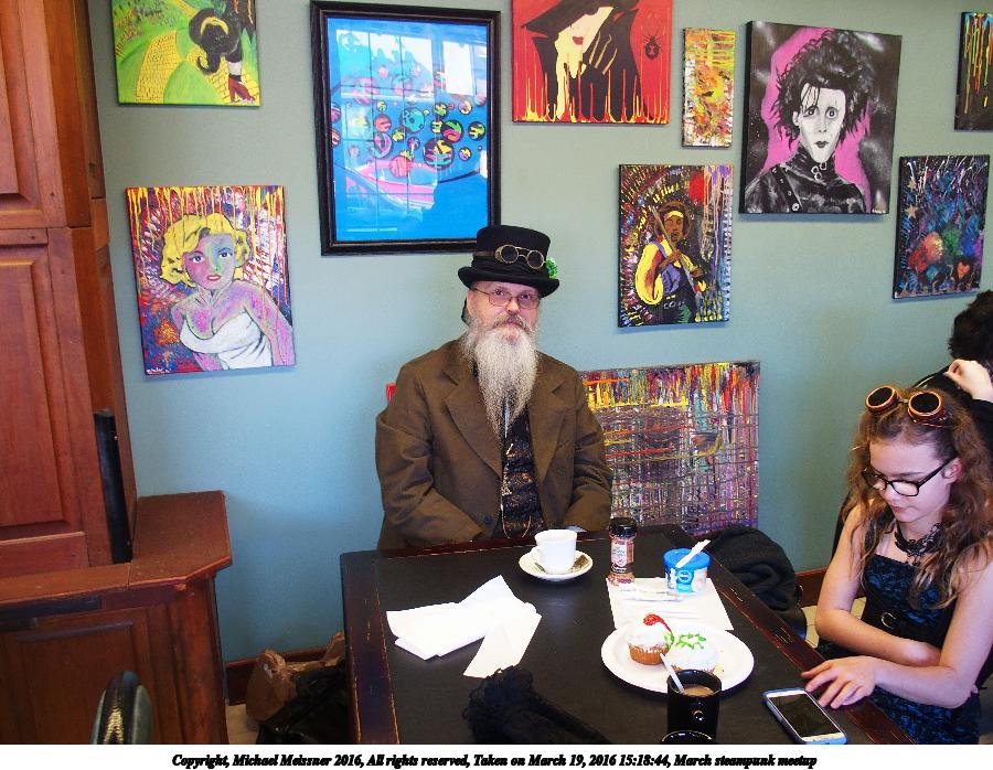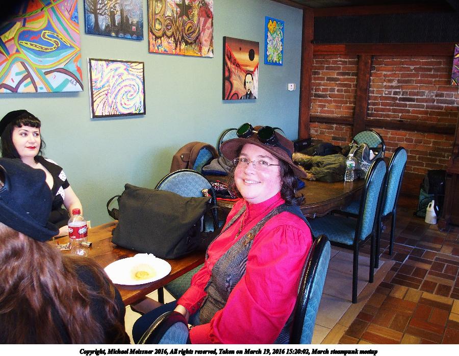 Picture #42: March steampunk meetup #8 800x623, 99,527 bytes (98K), (html file) Copyright, Michael Meissner 2016, All rights reserved Olympus Stylus-1 camera f/2.8, ISO 400, flash, 1/30 sec, 6.0mm, auto mode, vivid color, SHQ, matrix metering, IS Auto, noise reduction auto, noise filter low 35mm equivalent focal length 28.0mm Programs used: crop, gimp, raw therapee Taken by Michael Meissner on March 19, 2016 18:10:20 Last modified on March 22, 2016 at 09:58 |