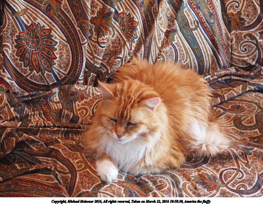 Picture #8: America the fluffy 900x698, 155,473 bytes (152K), (html file) Copyright, Michael Meissner 2016, All rights reserved Olympus Stylus-1 camera f/2.8, ISO 500, flash, 1/80 sec, 31.8mm, auto mode, vivid color, SHQ, matrix metering, IS Auto, noise reduction auto, noise filter low 35mm equivalent focal length 150.0mm Programs used: crop, raw therapee Taken by Michael Meissner on March 22, 2016 10:57:59 Last modified on March 26, 2016 at 01:32 |