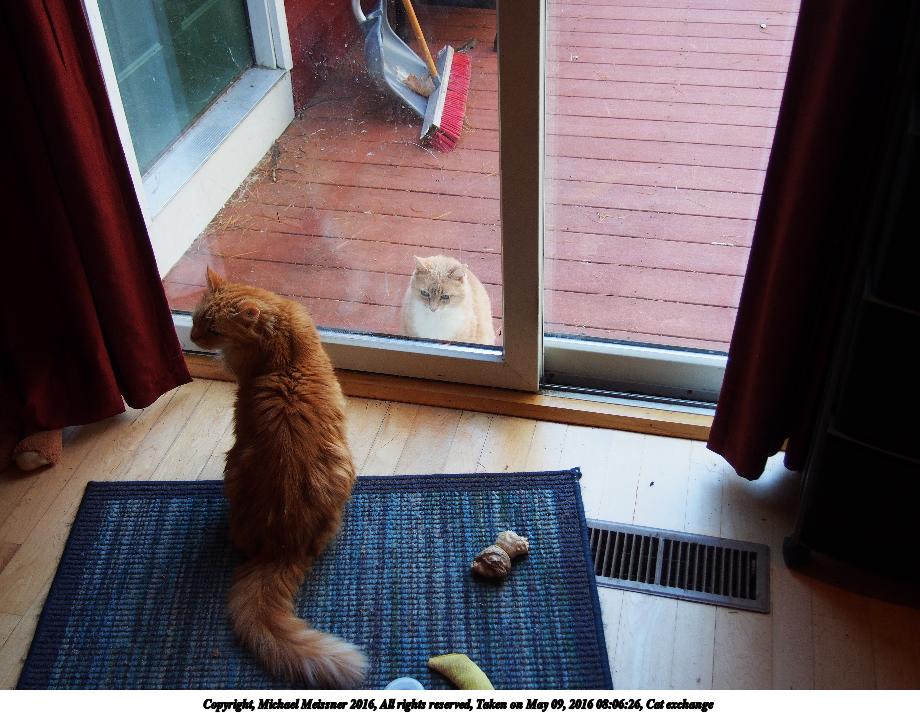 Picture #63: Cat exchange #2 920x713, 124,541 bytes (122K), (html file) Copyright, Michael Meissner 2016, All rights reserved Olympus E-PM2 camera with Olympus-m43 14-42mm-IIR f/3.5-5.6 lens f/4.0, ISO 320, 1/60 sec, 19.0mm, auto mode, vivid color, matrix metering, IS1 (All Direction Shake IS), noise filter low 35mm equivalent focal length 38.0mm Programs used: crop, raw therapee Taken by Michael Meissner on May 09, 2016 08:06:26 Last modified on May 09, 2016 at 10:43 |