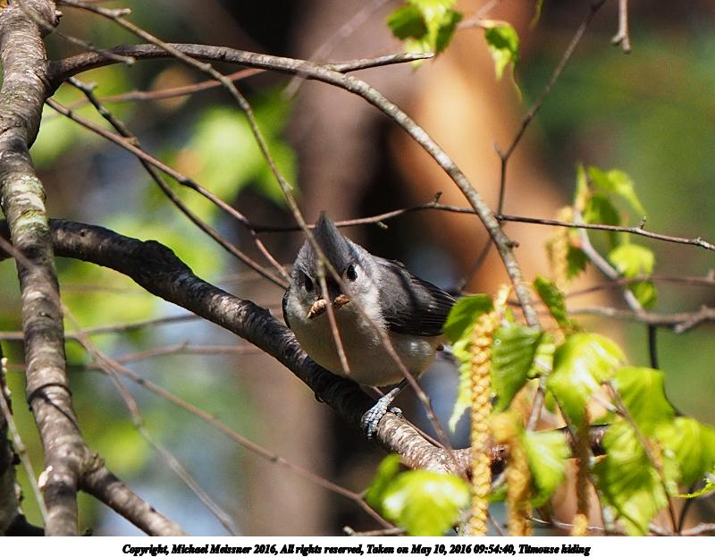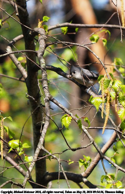 Picture #45: Titmouse hiding #3 800x623, 96,866 bytes (95K), (html file) Copyright, Michael Meissner 2016, All rights reserved Olympus E-M1-I camera with Olympus 50-200mm lens f/5.0, ISO 200, 1/800 sec, 117.0mm, auto mode, vivid color, SHQ, matrix metering, digital zoom x2, IS Auto, noise filter low 35mm equivalent focal length 469.0mm, digital zoom x2 Programs used: crop, raw therapee, rotate left Taken by Michael Meissner on May 10, 2016 09:54:40 Last modified on May 10, 2016 at 10:21 This picture is one of my favorites. |