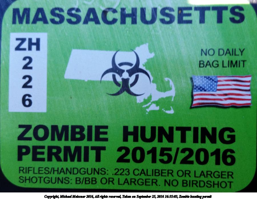 Picture #1: Zombie hunting permit 900x698, 92,356 bytes (91K), (html file) Copyright, Michael Meissner 2016, All rights reserved Samsung S5 phone f/2.2, ISO 40, 1/120 sec, 4.8mm, auto mode, center weight metering 35mm equivalent focal length 31.0mm Programs used: gimp Taken by Michael Meissner on September 25, 2016 16:35:03 Last modified on September 25, 2016 at 18:03 |